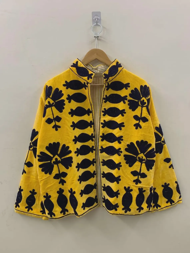 Hand Embroidered Velvet Suzani Winter Coat Windproof Bomber Short Jacket with Cotton Filling Ethnic Outerwear for Street Style