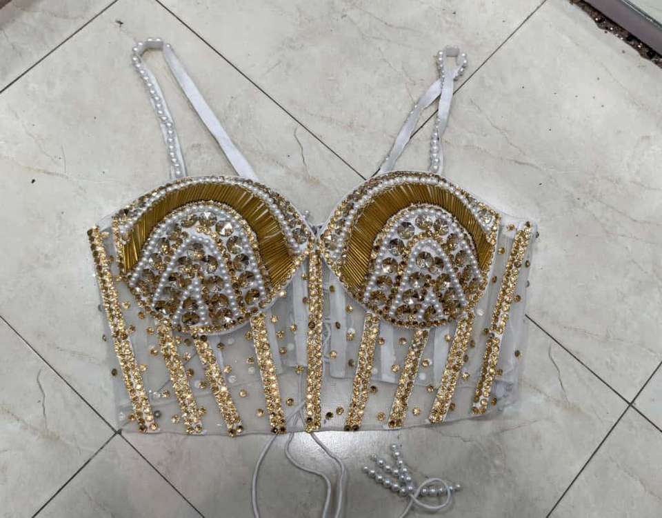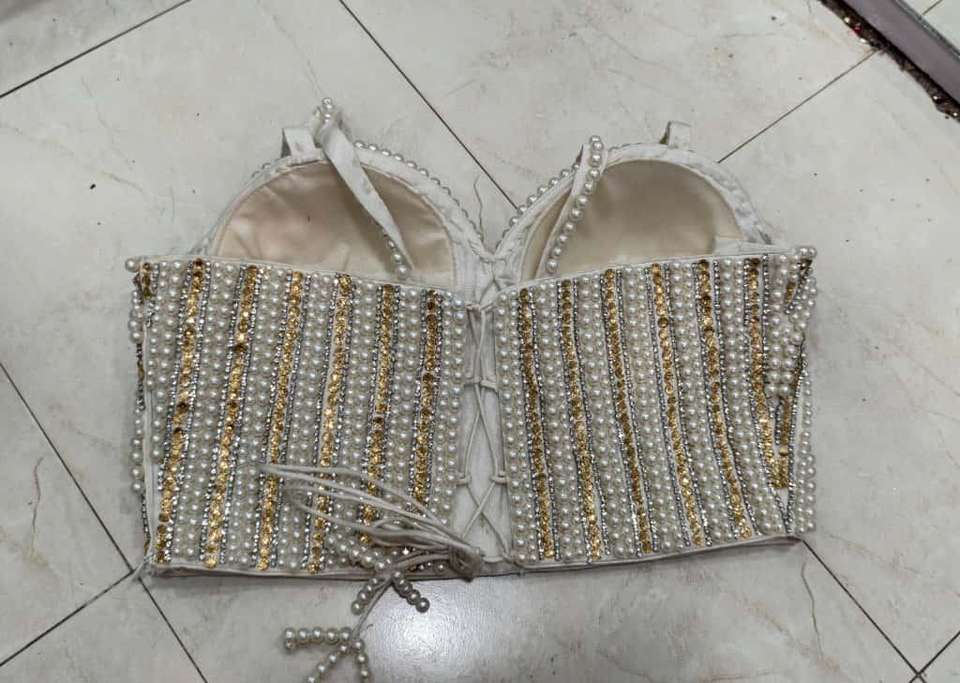 Corset bustier court d'hiver blanc brodé à la main, tissé, avec col cœur, perles, strass et ornements dorés