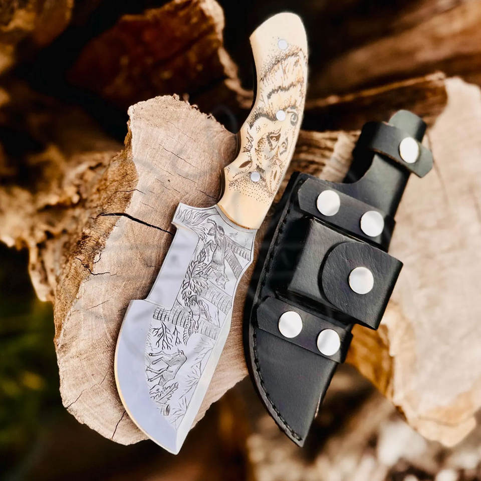 Couteau Tracker Gravé à la Main, Manche en Os de Chameau et Étui en Cuir