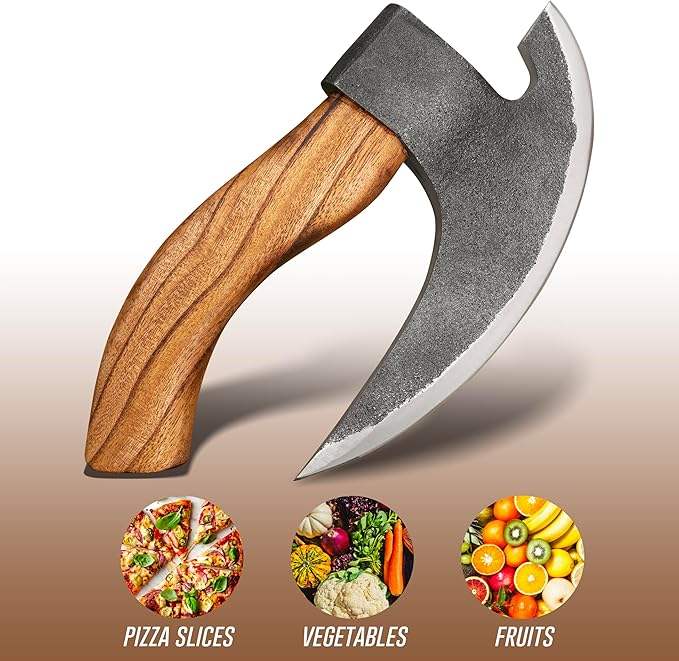 Hache à pizza forgée à la main, style viking, personnalisée OEM, avec manche en bois, acier au carbone, étui en cuir