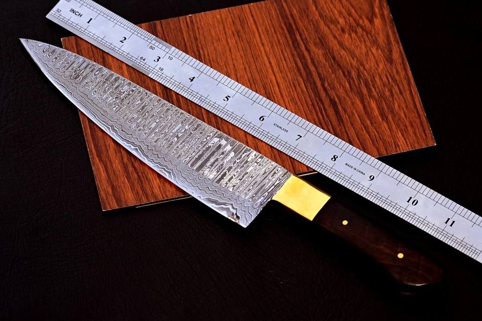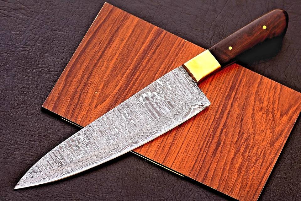 Couteau de chef en acier Damas forgé à la main avec manche en bois de rose et embout en laiton, lame pleine longueur, personnalisable, OEM, couteaux de cuisine professionnels