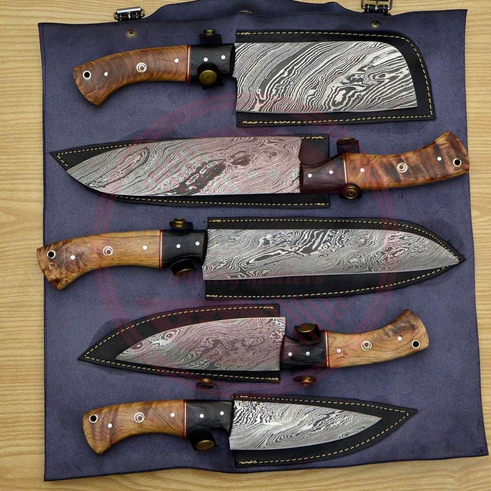 Ensemble de couteaux de chef en acier damas forgé à la main \ Ensemble de 5 couteaux en acier damas à lame fixe en gros