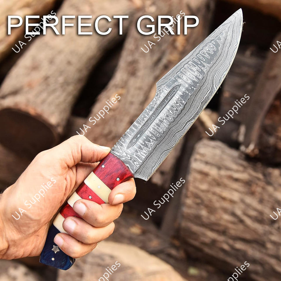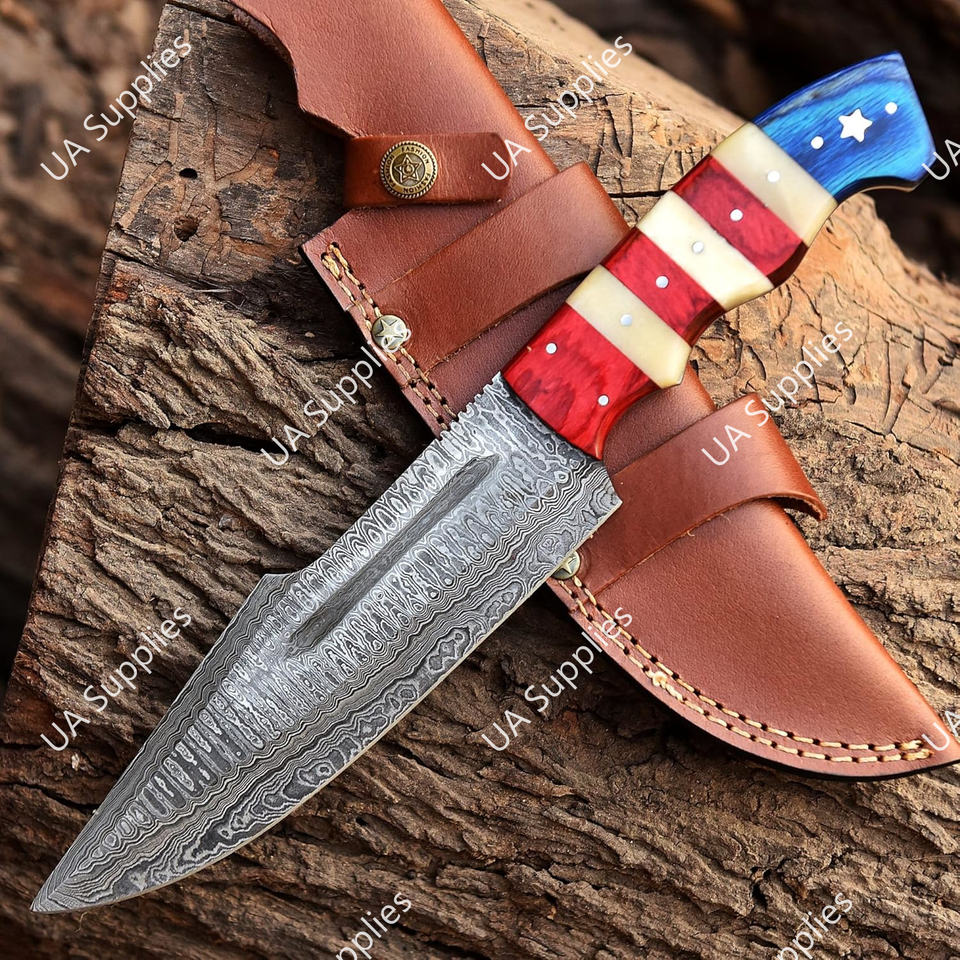 Couteau Bowie de chasse d'extérieur professionnel en acier Damas forgé à la main, pointe tombante, lame pleine, ultra-affûtée, manche en bois coloré et os.