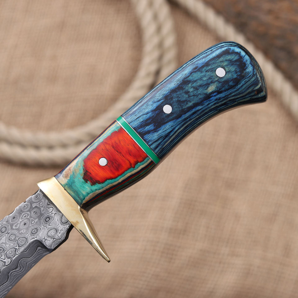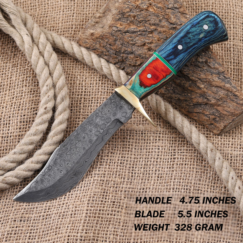 Couteau Bowie à lame fixe en acier Damas forgé à la main avec étui, couteau de chasse et de camping personnalisé OEM à lame pleine, manche en bois Pakka