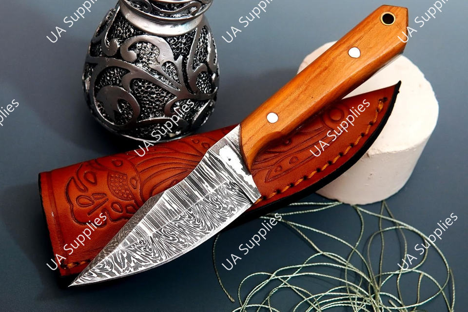 Couteau de chasse professionnel haut de gamme en acier Damas forgé à la main, à lame pleine, pointe tombante, pour l'extérieur, avec étui en cuir