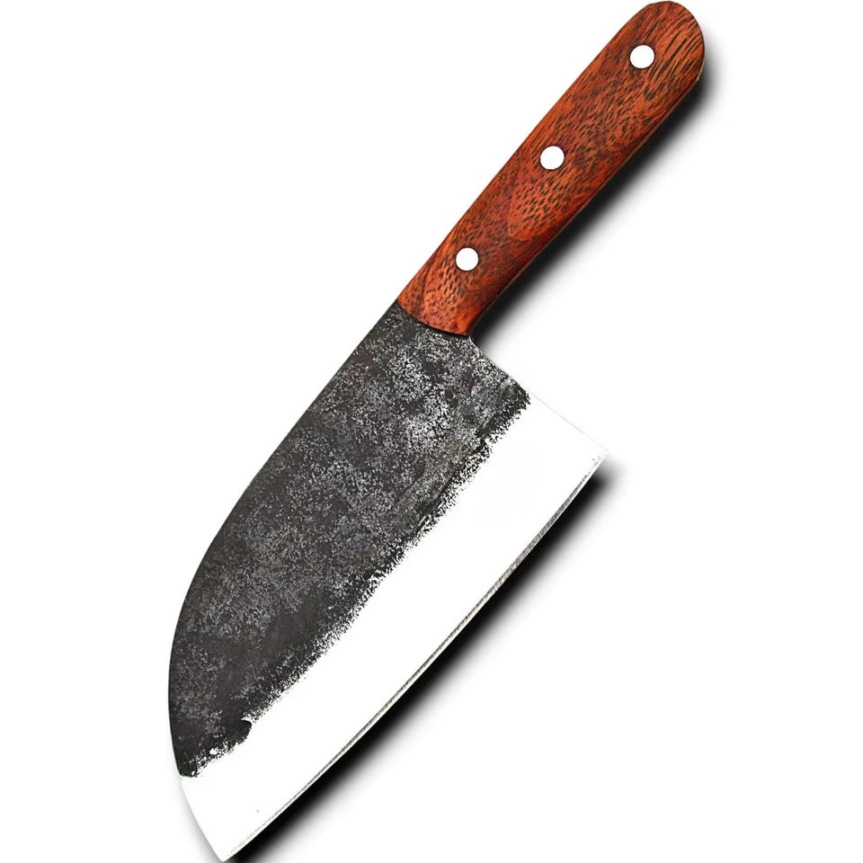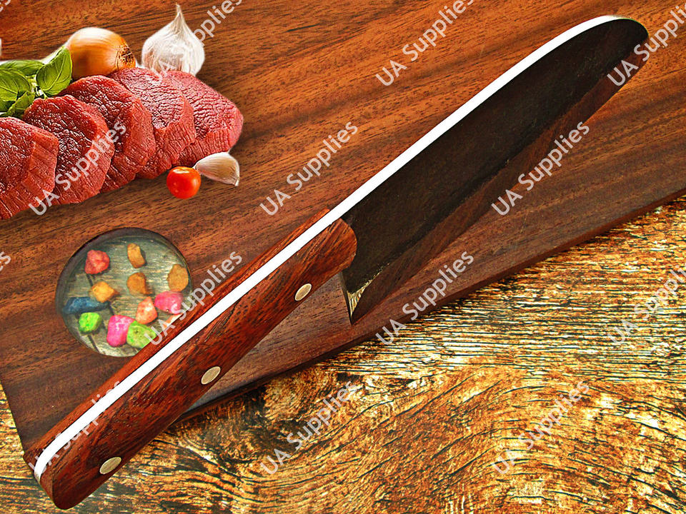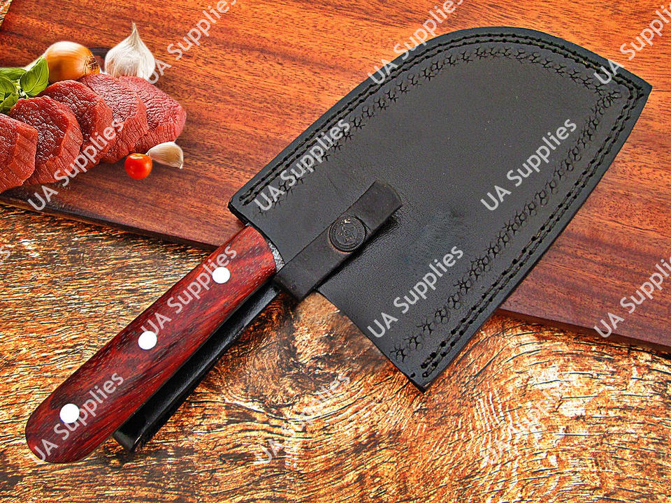 Couteau de chef serbe forgé à la main, à lame pleine, robuste, vintage, ambidextre, ergonomique, avec manche en bois de rose et étui en cuir
