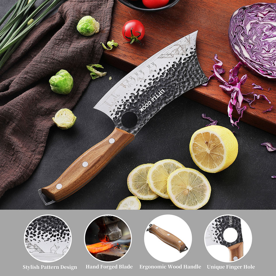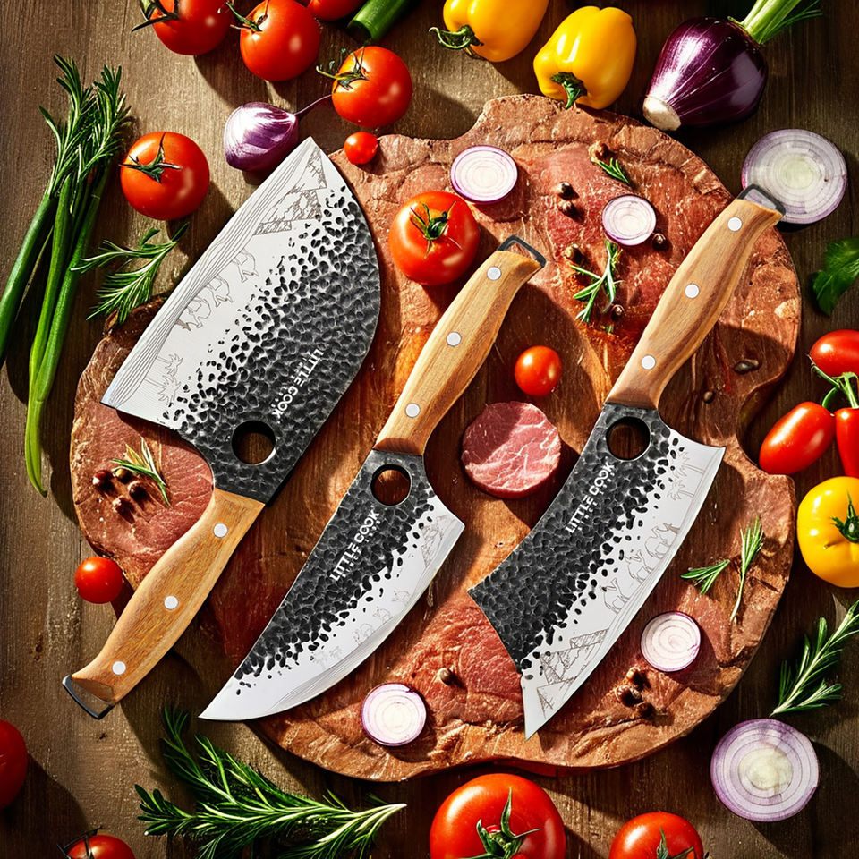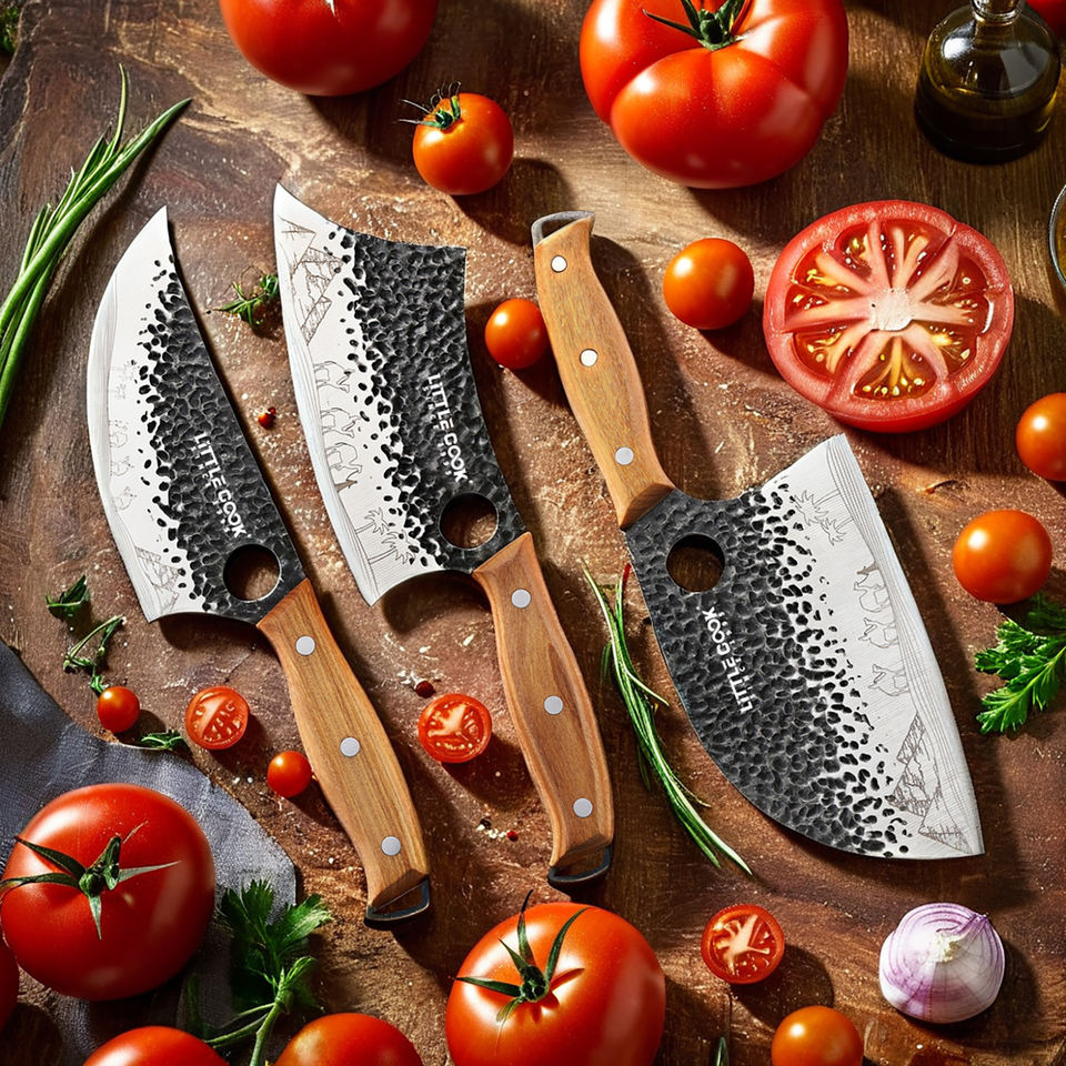 Ensemble de couteaux de cuisine forgés à la main avec couteau de boucher serbe, couteau de chef et couteau viking, manche en bois, ensemble de couteaux de boucher de qualité