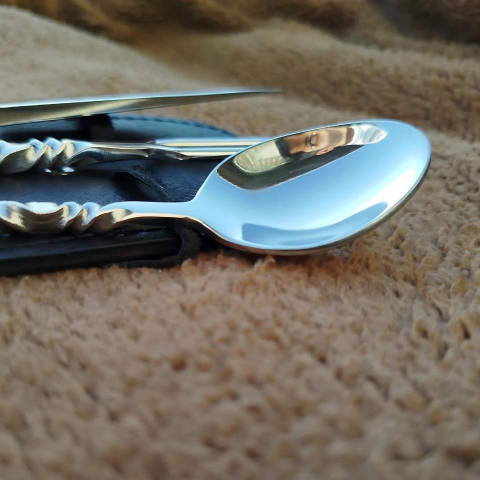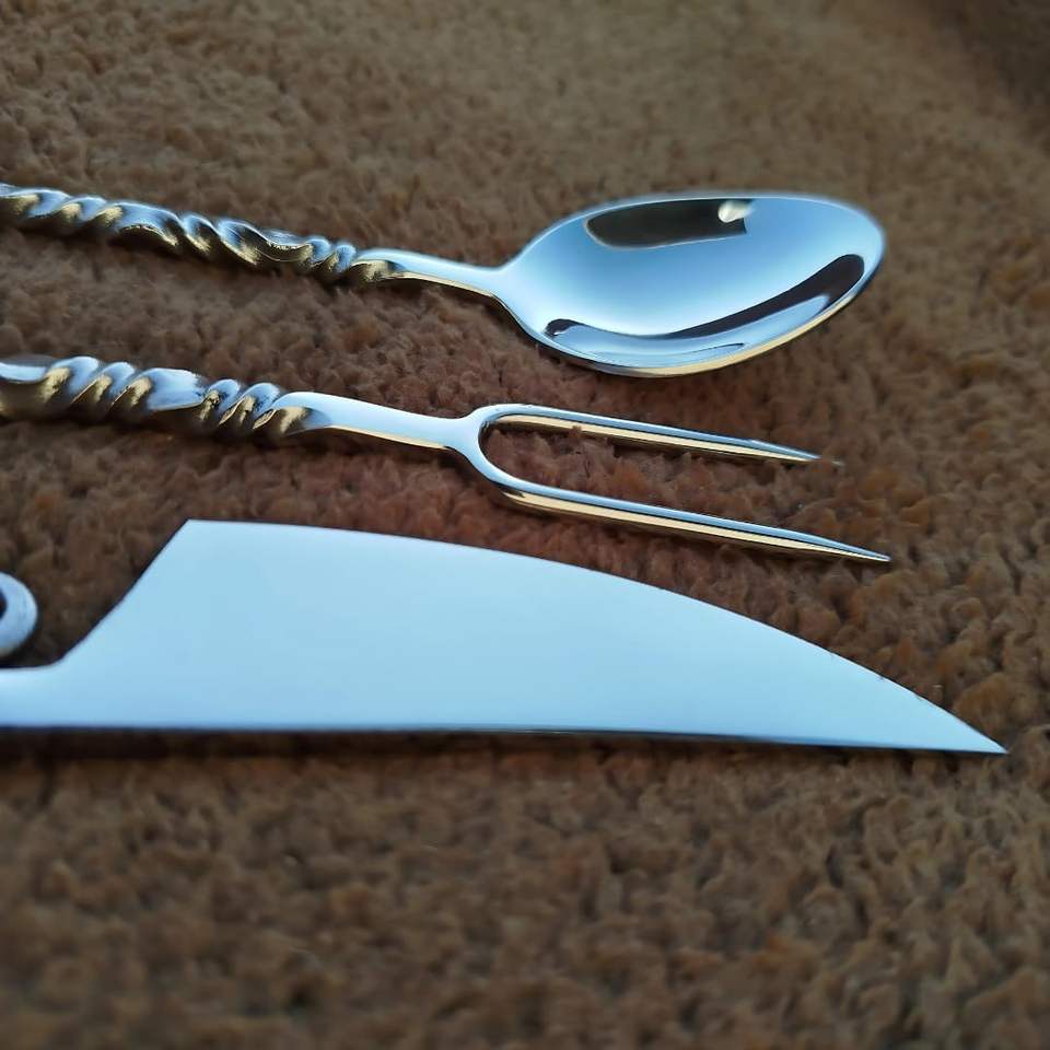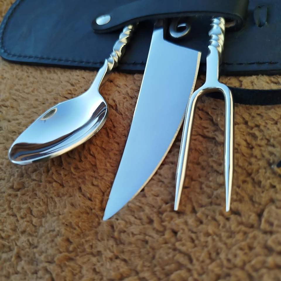 Ensemble de couverts médiévaux de haute qualité forgés à la main - Ensemble de 3 pièces, fourchette, cuillère, couteau viking, housse en cuir, couverts de luxe pour la maison