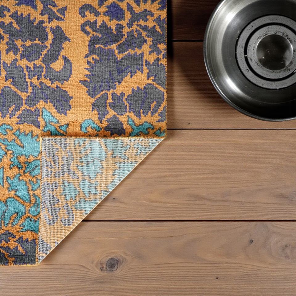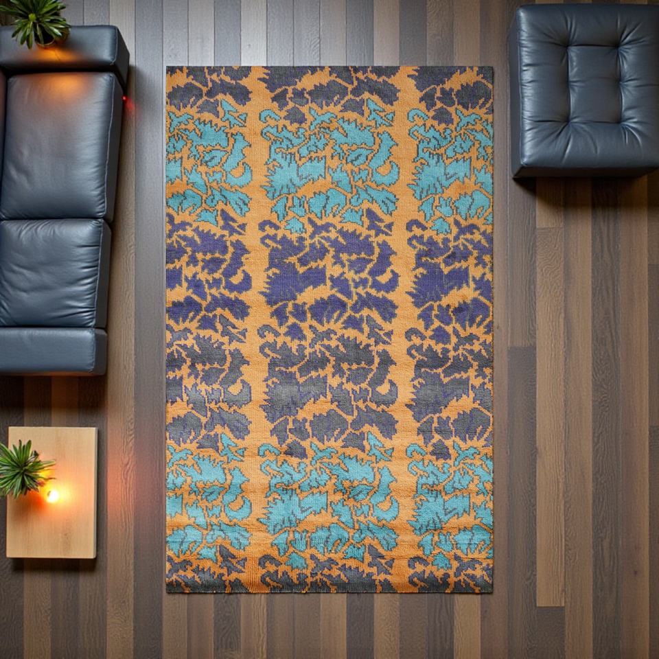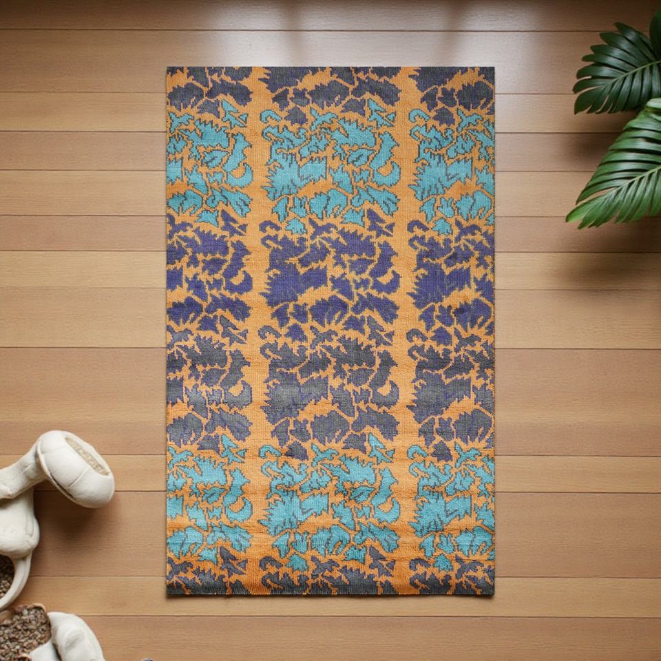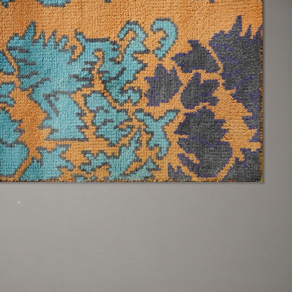 Tapis en laine noué à la main, motif abstrait, écologique, bleu turquoise, moutarde, tapis de salon
