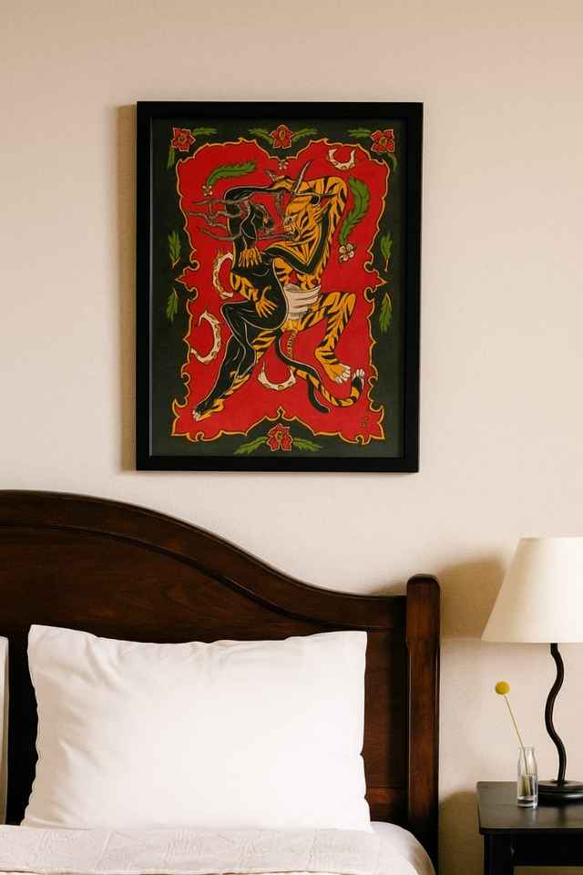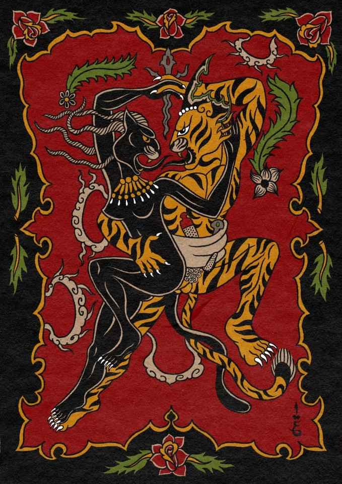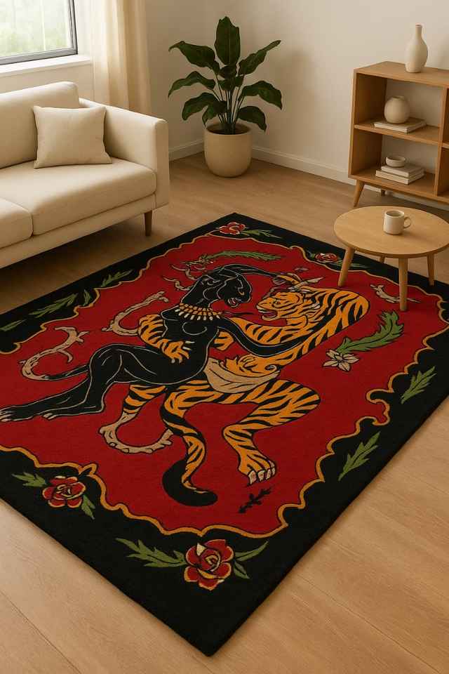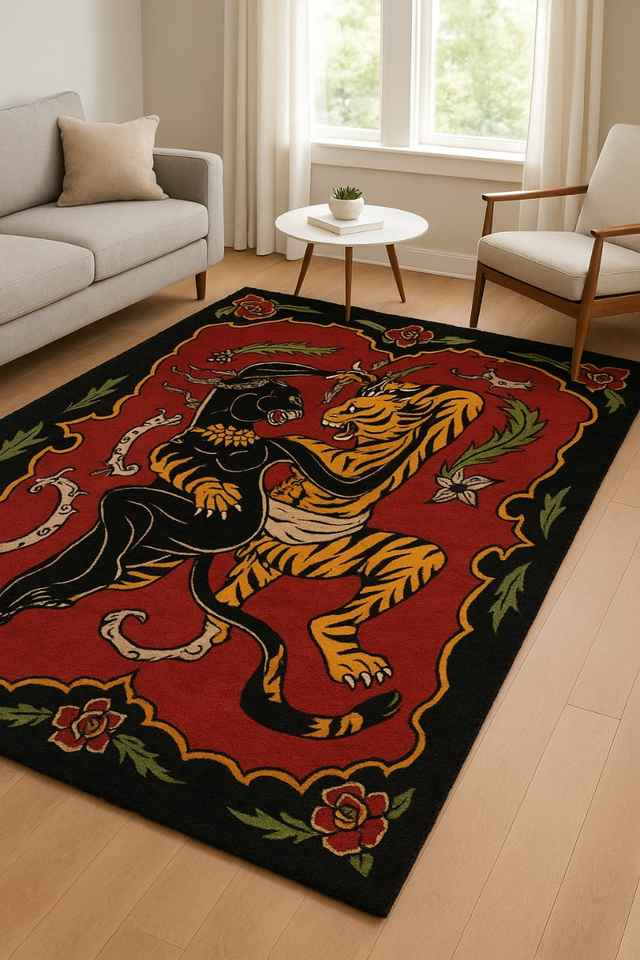Tapis en laine noué à la main-Conception de combat tigre et panthère | Tapis de déclaration de luxe | Tapis persans coupés de haute qualité