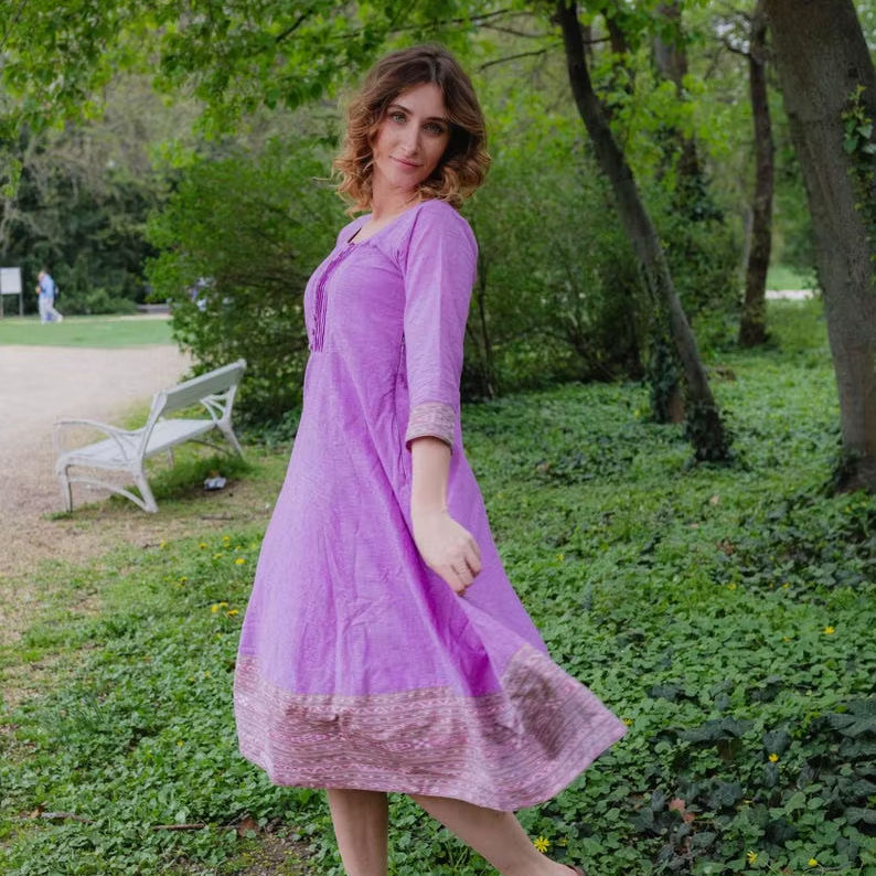 Robe en coton pur de style bohème décontractée occasionnelle, tissée à la main, en ikat, longueur mi-mollet, mode éthique, fabriquée à la main