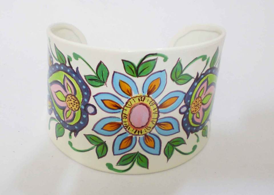 Bracelet manchette en cuivre émaillé, peint à la main, motif floral coloré, pour femme, design floral artistique, base blanche, large, style affirmé, artisanat métallique
