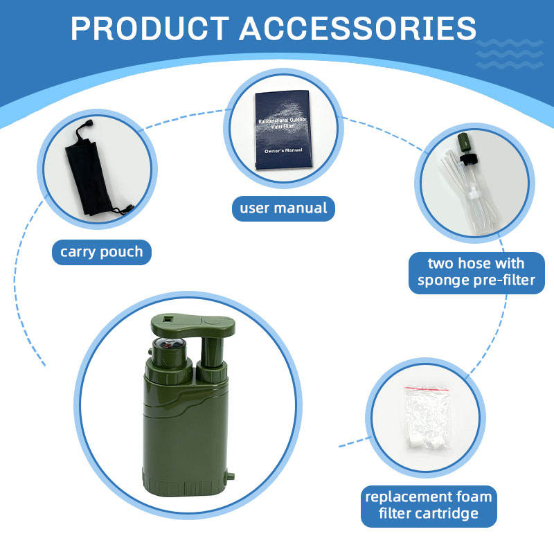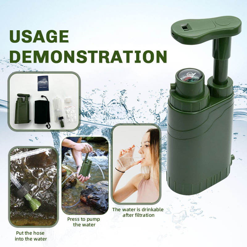 Filtre à eau à pression manuelle avec couteau à boussole et silex pour le camping, la randonnée, la survie en cas d'urgence, équipement de plein air