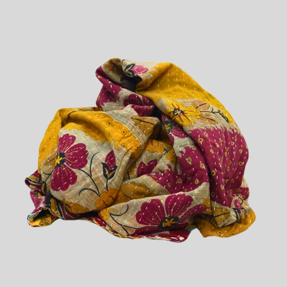 Couette Kantha cousue à la main avec des motifs uniques et des textiles recyclés d'Inde