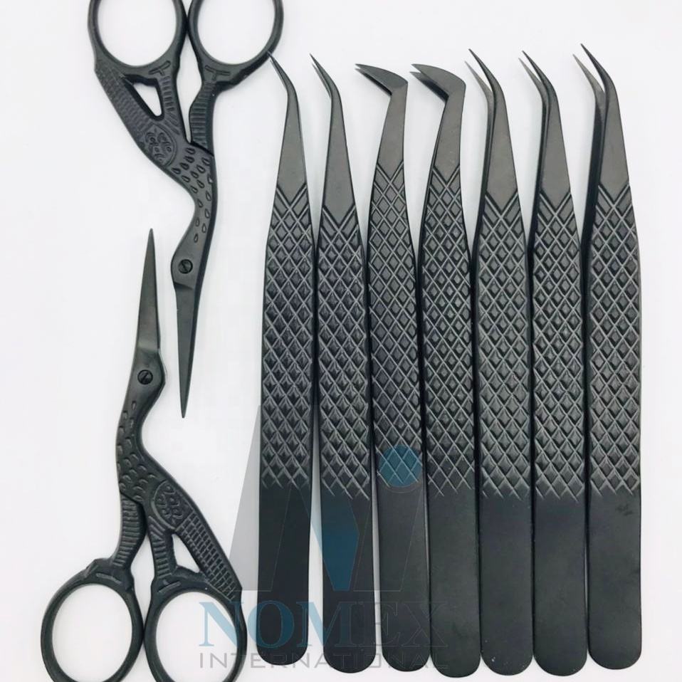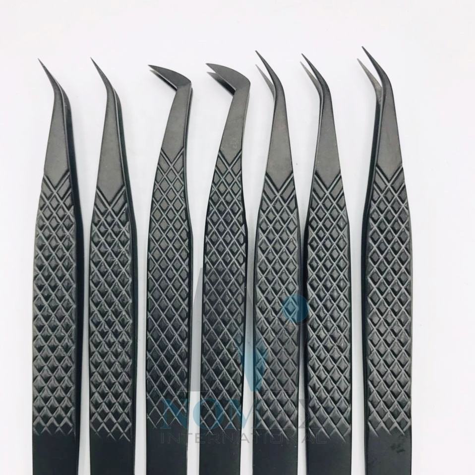Ensemble de 7 pinces à cils de couleur noire testées à la main Outils à cils en acier inoxydable durables, y compris 2 pièces grue pointue