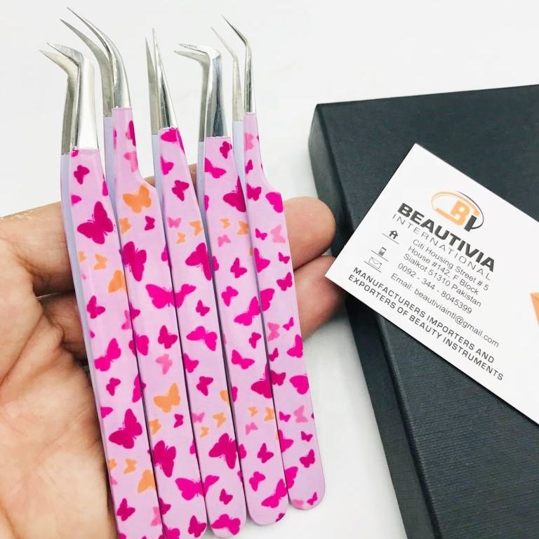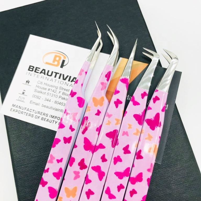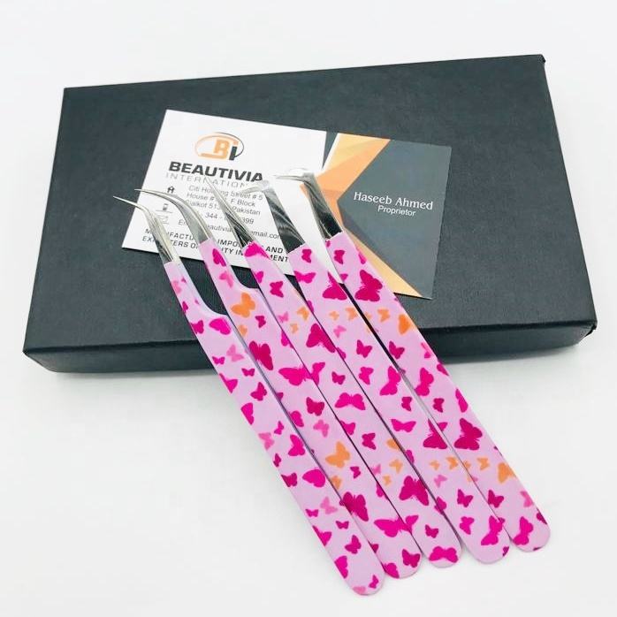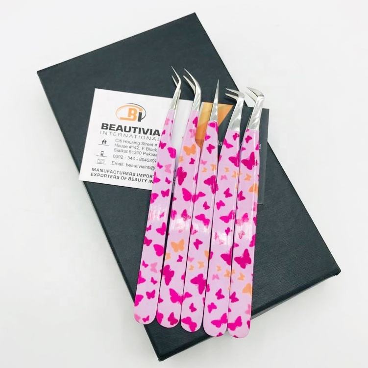 Pince à épiler d'extension de cils imprimée papillon testée à la main en acier inoxydable durable avec pointe pointue