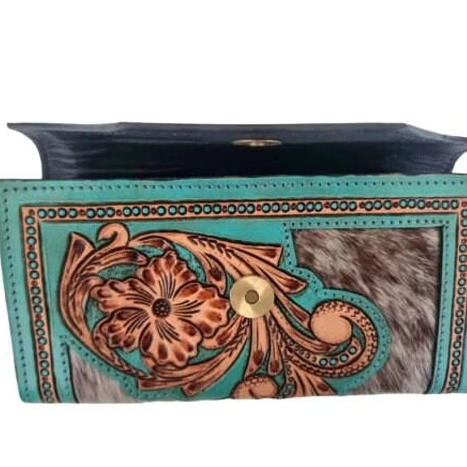 Portefeuille-pochette à rabat en cuir véritable bleu ciel pour femme, style bohème, avec broderie artisanale