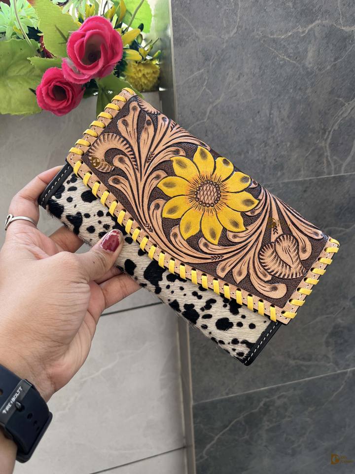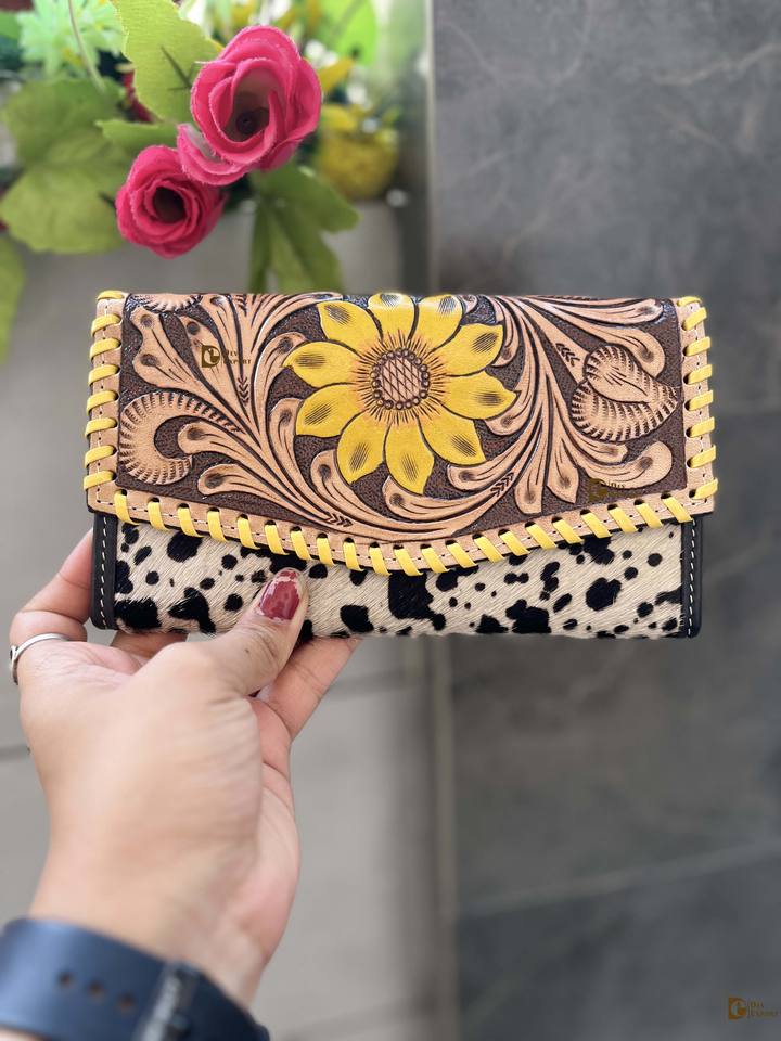 Porte-monnaie sculpté usiné à la main pochette coque de téléphone élégant fleur de soleil couleur jaune portefeuille pour femmes multi-usages portefeuilles en cuir occidental