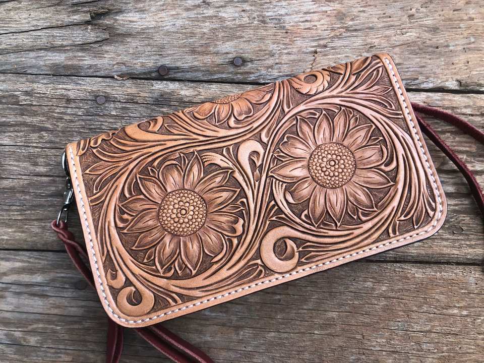 Portefeuille pour femme en cuir véritable marron 100% véritable, sculpté à la main avec des motifs floraux, imperméable, avec plusieurs emplacements pour cartes et espèces