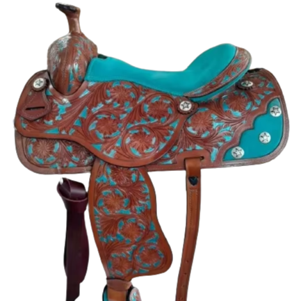 Selle de barrel racing western en cuir façonnée à la main, siège sculpté floral turquoise, conchos argentés, 10"–18"