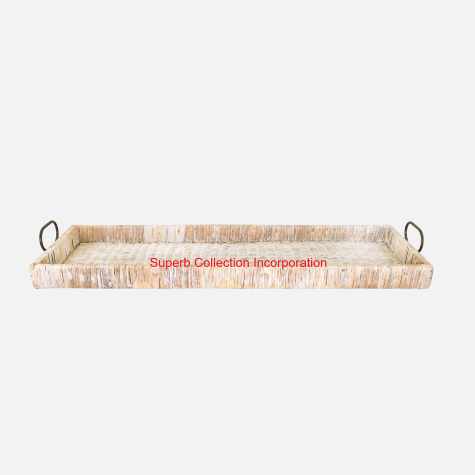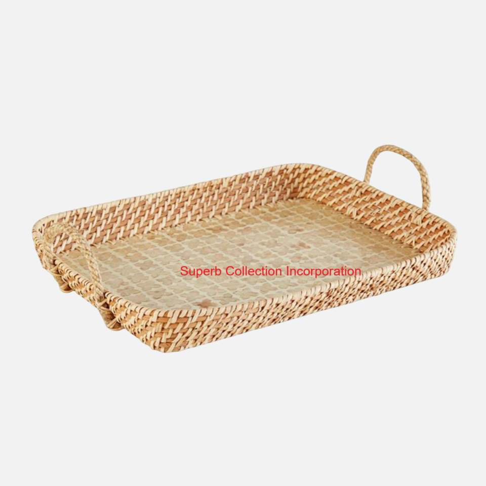 Plateau de service en rotin naturel tissé à la main avec poignées en cuir Plateau de rangement décoratif en osier rectangulaire pour l'organisation de la cuisine