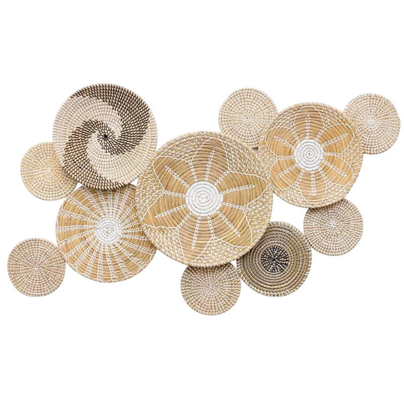 Hand Woven Seagrass Wall Mounted Basket 6 PCs Rattan Round Straw Flat Plate Rustic Hanging Basket for Wall Decoration items