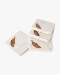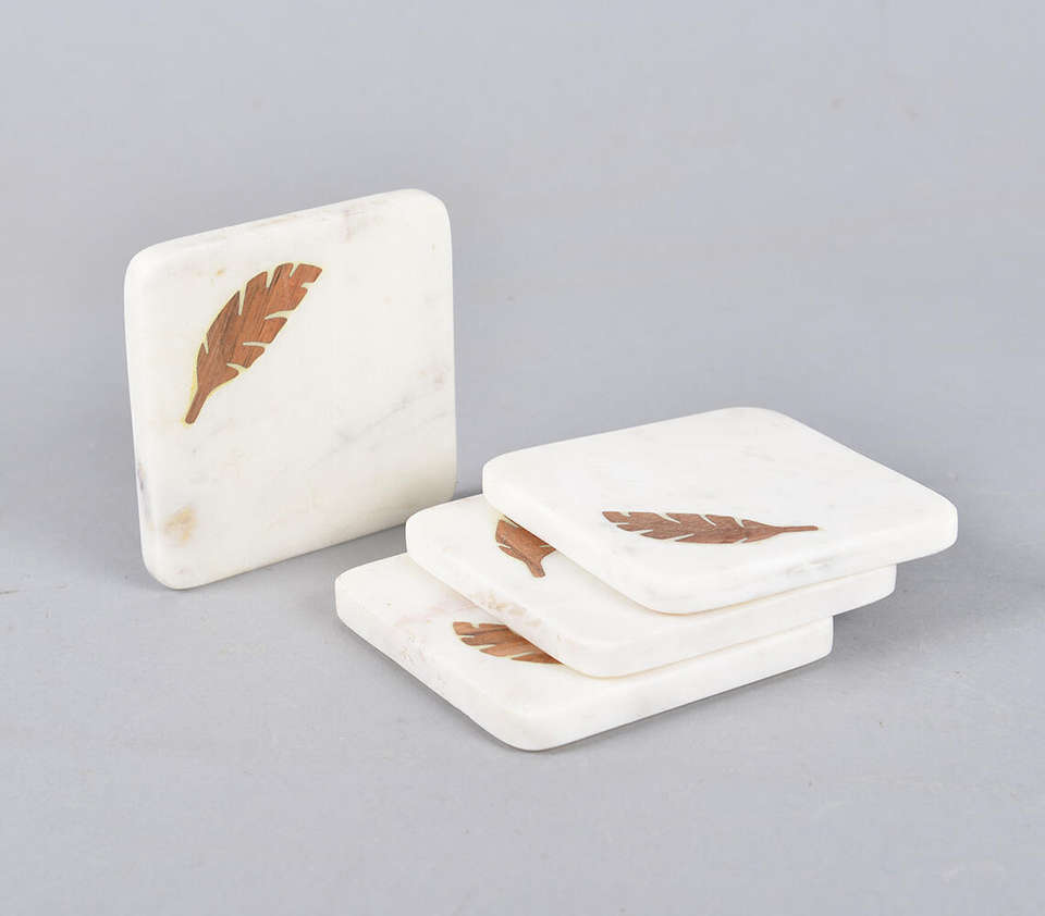 Sous-verre carré minimaliste en marbre blanc avec incrustation de plumes en bois naturel, pièce unique, dessous de plat, vente en gros personnalisée pour la maison