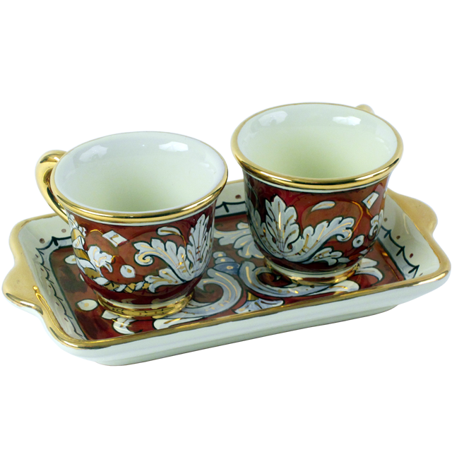 Service à café en céramique fait main avec 2 tasses et un plateau, peint à la main avec de l'or pur et un lustre métallique rouge