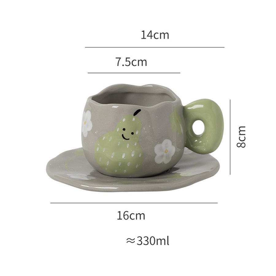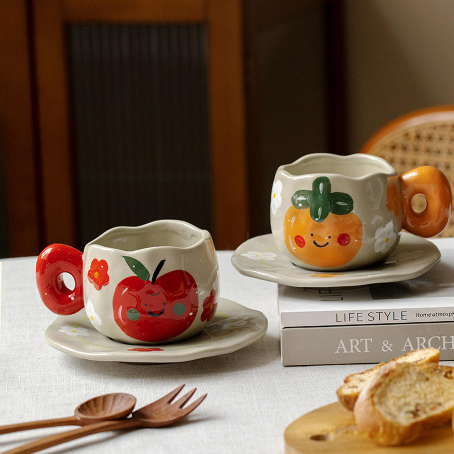 Hand-painted Pear, Persimmon, apple Coffee Cups and Saucers, Creative Hand-molded Irregular Ceramic Afternoon Cups and Saucers