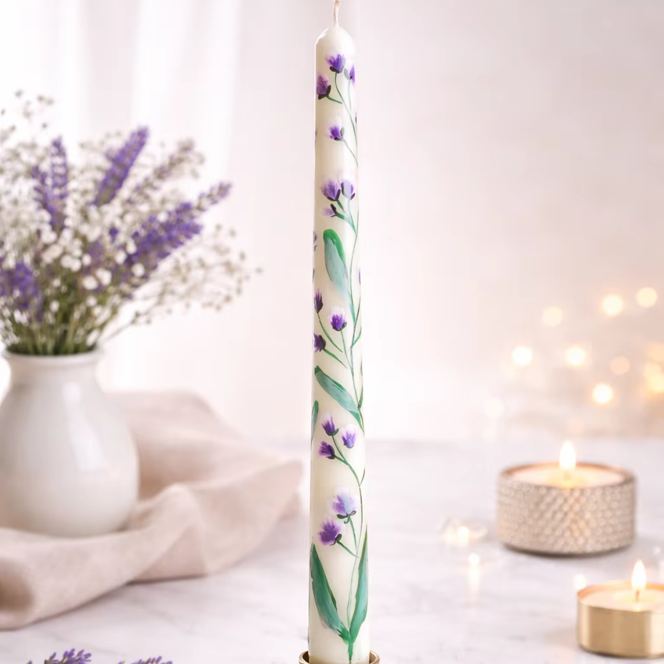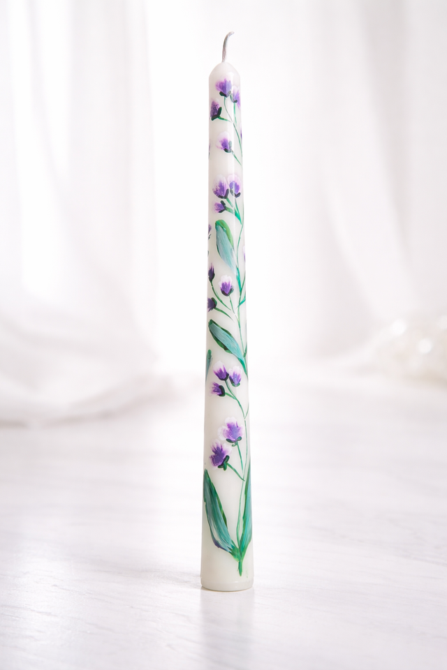 Bougie conique peinte à la main, motifs complexes de marguerites roses et blanches, feuillage violet lavande, parfum de rose, sans fumée, pour la décoration de Noël à la maison