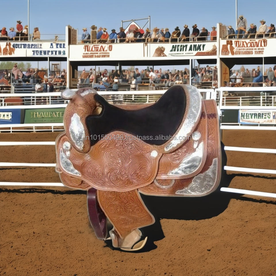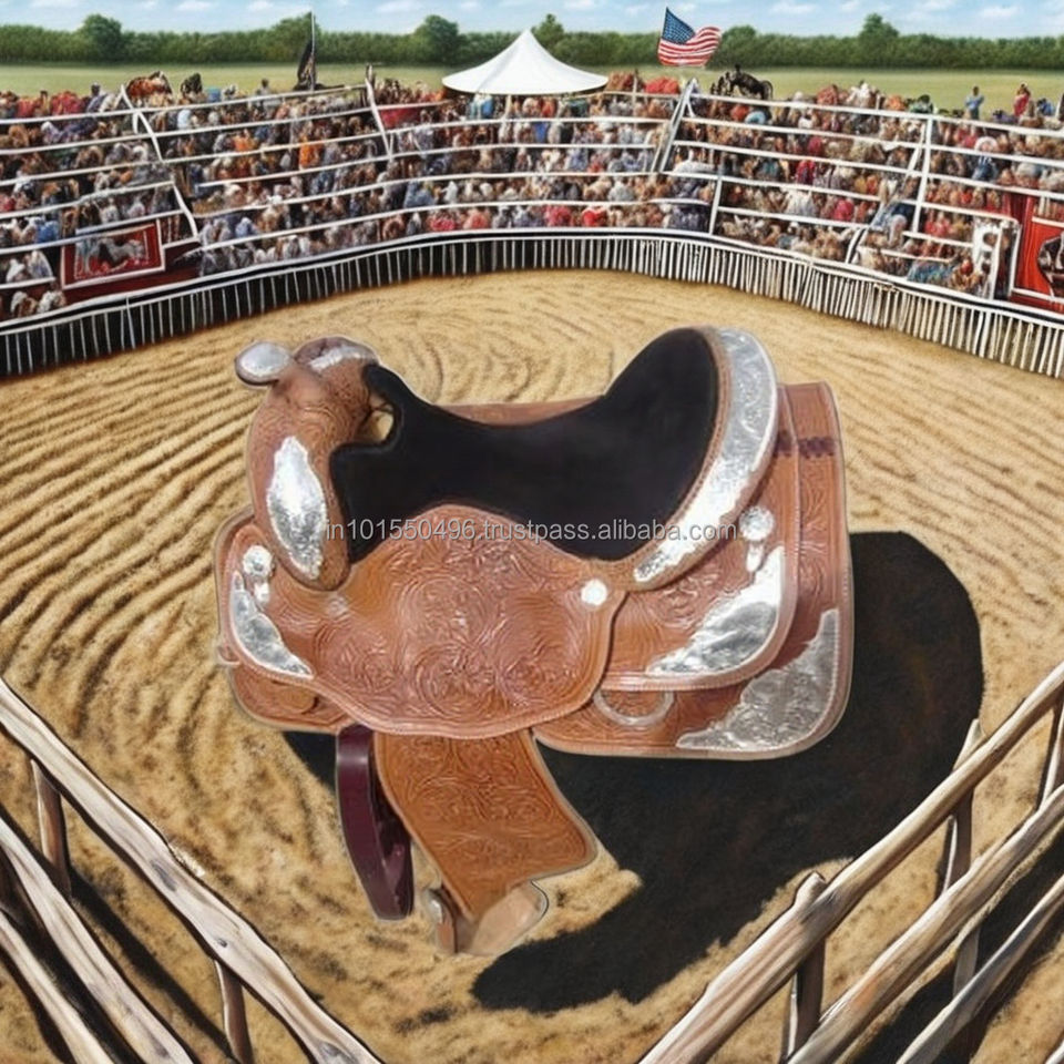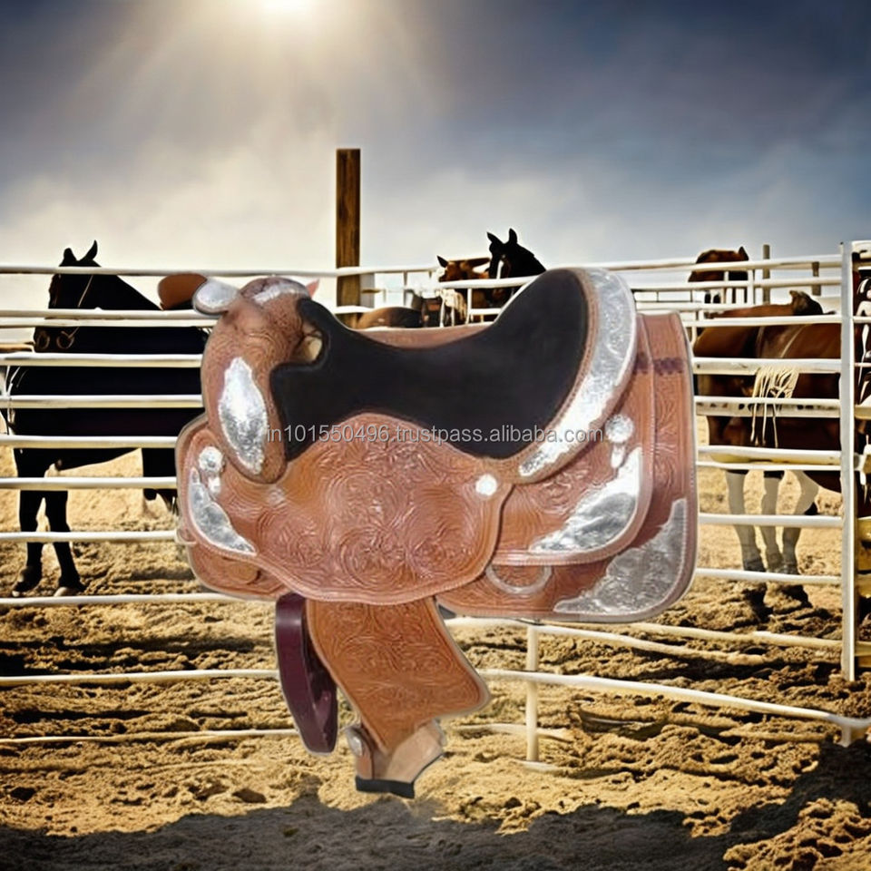 Selles western en cuir véritable, fabriquées à la main, sculptées à la main avec des plaques décoratives plaquées argent, pour l'équitation et la compétition.