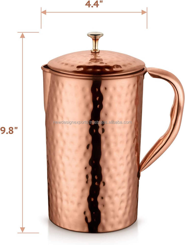 Pichet en cuivre pur 100% fabriqué à la main 2 verres verres jetables en métal écologiques pour la santé potable martelée ayurvédique