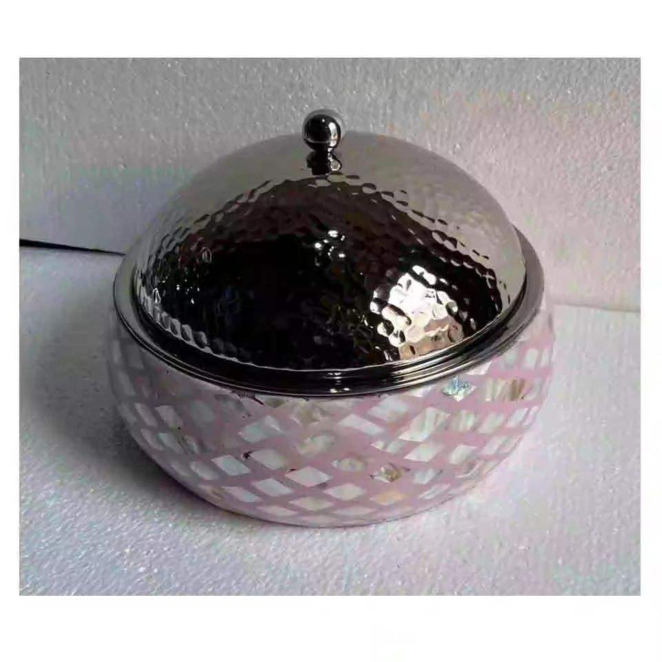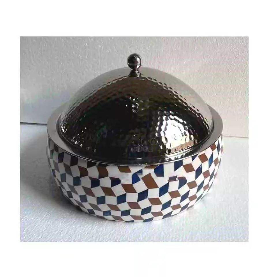 Casserole artisanale 3D géométrique en os incrusté avec couvercle en métal martelé, chauffe-plat haut de gamme pour table de luxe
