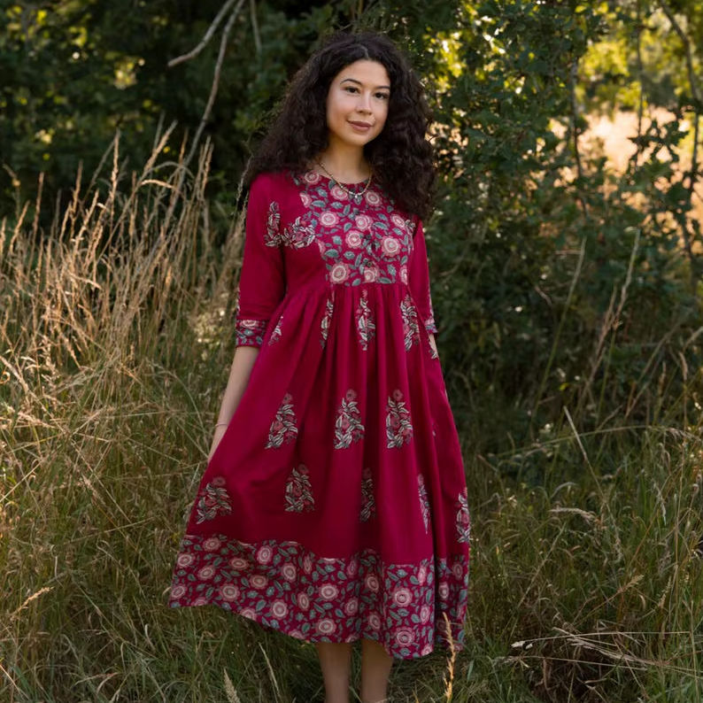 Handcrafted Amélia Bohemian Dress Ethical Cotton Block Print Holiday Dress