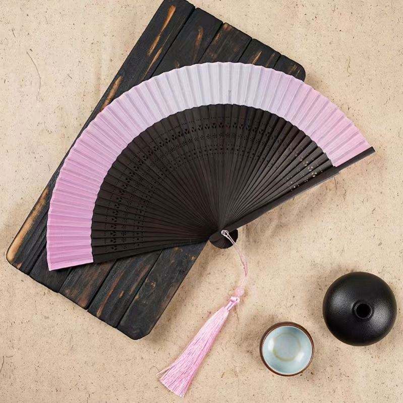 Ventilateur portable artisanal en bambou à changement de couleur avec manche et motif croisé sculpté