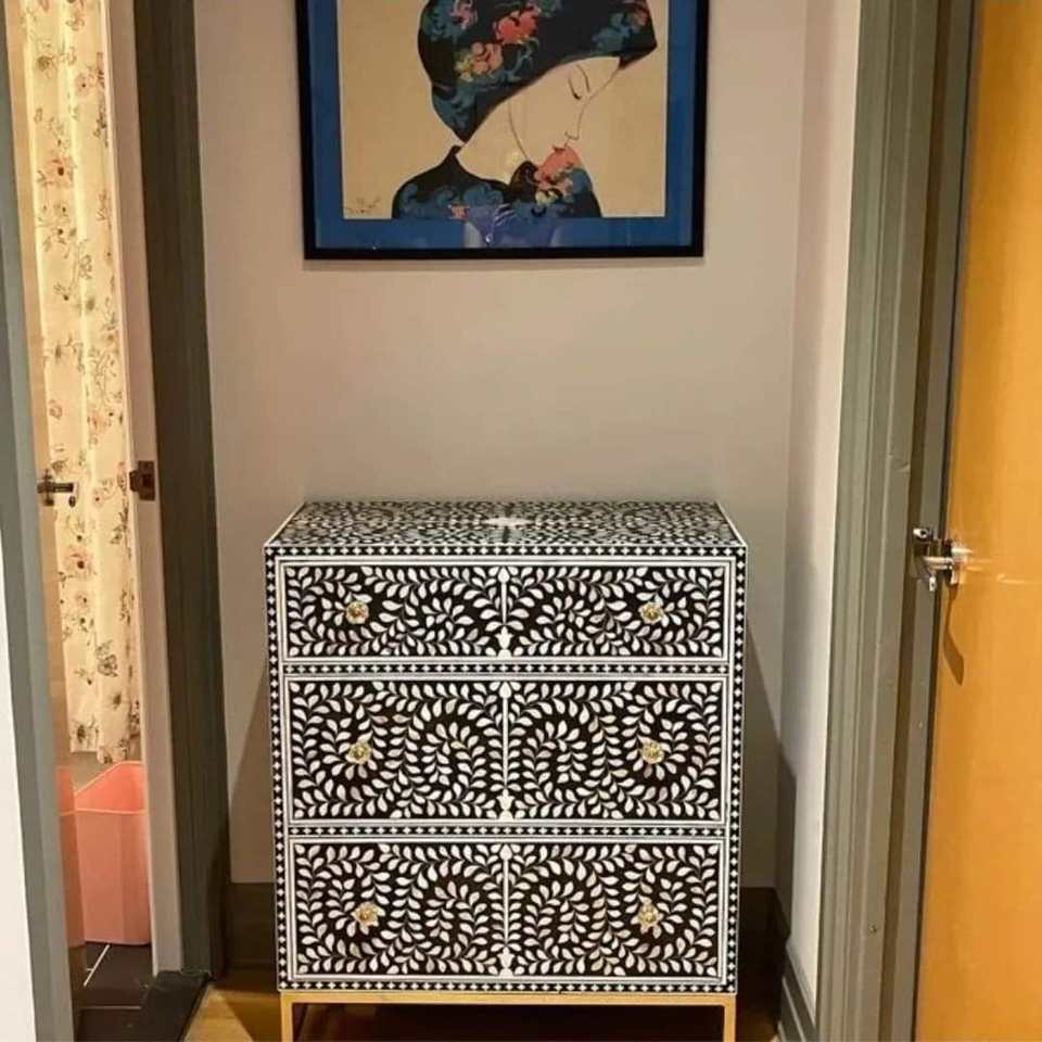 Commode à tiroirs artisanale en os incrusté noir et blanc | Commode en bois à motifs floraux vintage pour le salon, décoration intérieure