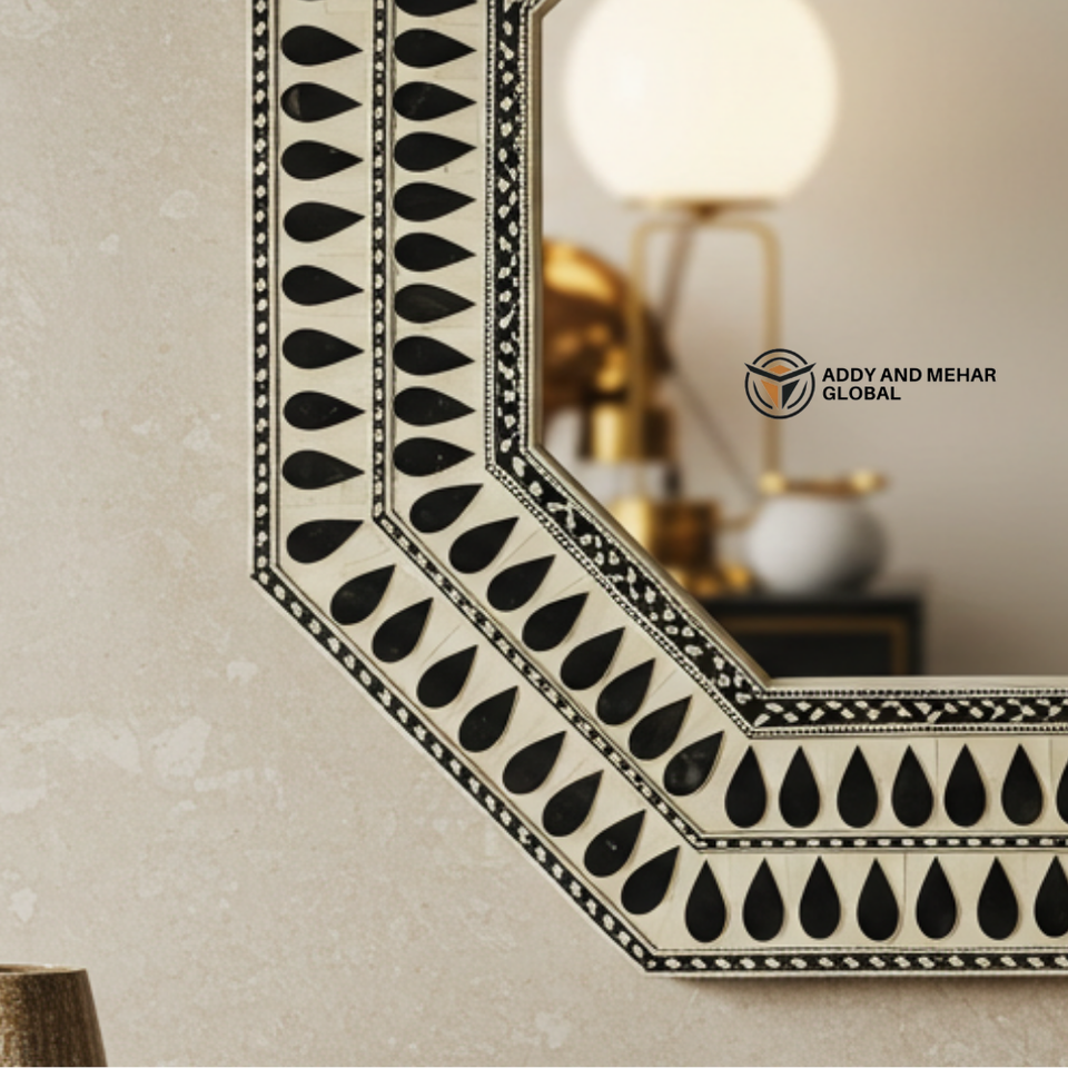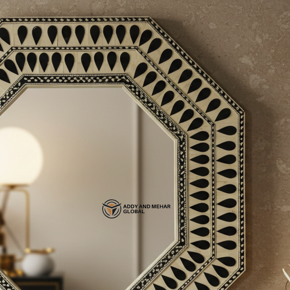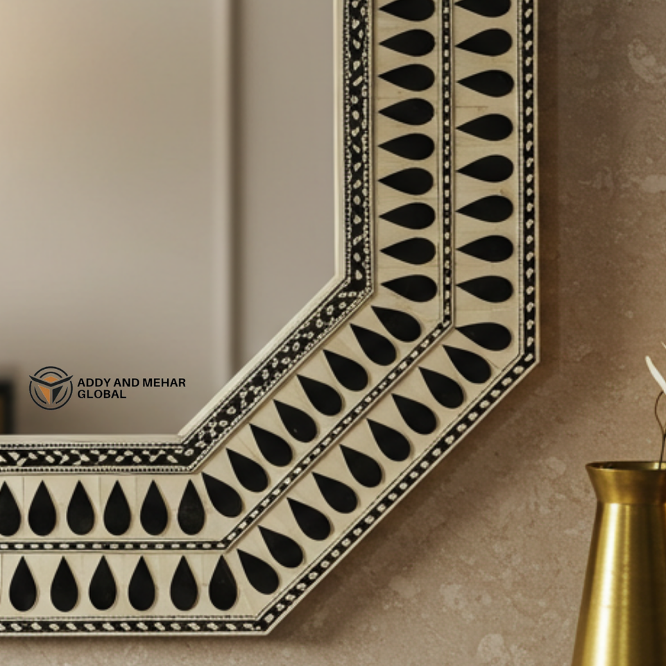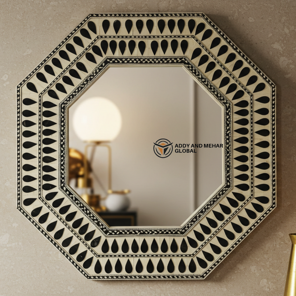 Miroir octogonal en incrustation d'os noir et blanc fait à la main, motif en forme de larme, décoration murale, miroir d'accent décoratif pour la vente en gros