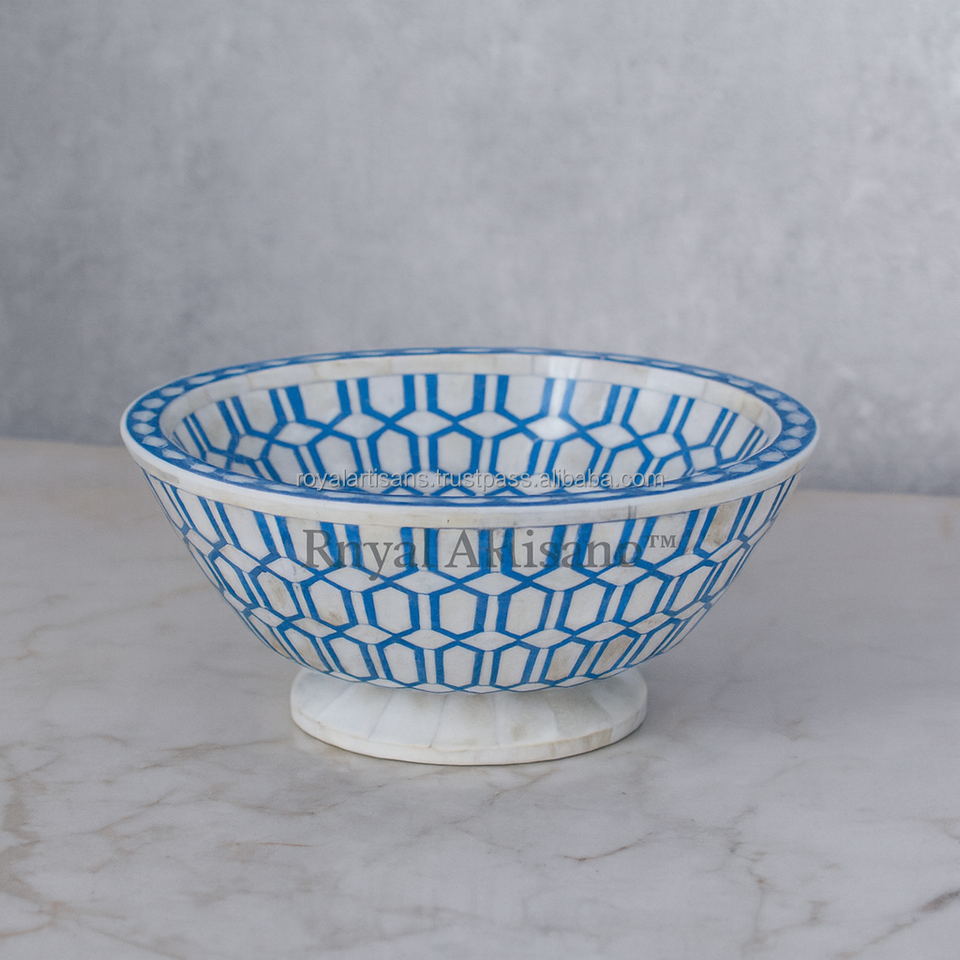 Bol décoratif artisanal en os bleu poli avec incrustations, base en laiton, vaisselle de luxe artisanale, accent de décoration intérieure, Inde