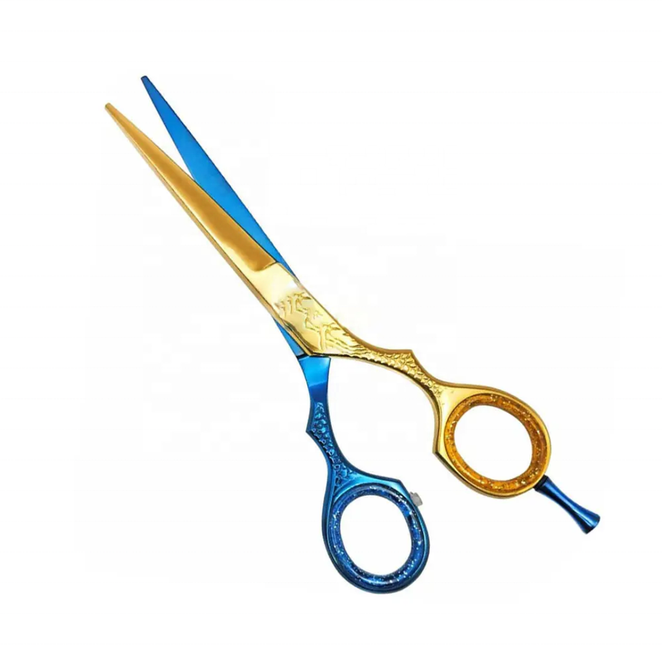 Ciseaux de coiffeur bleu et or fabriqués à la main outils de coupe de cheveux avec pointe de lame tranchante et repose-doigts fournitures de salon