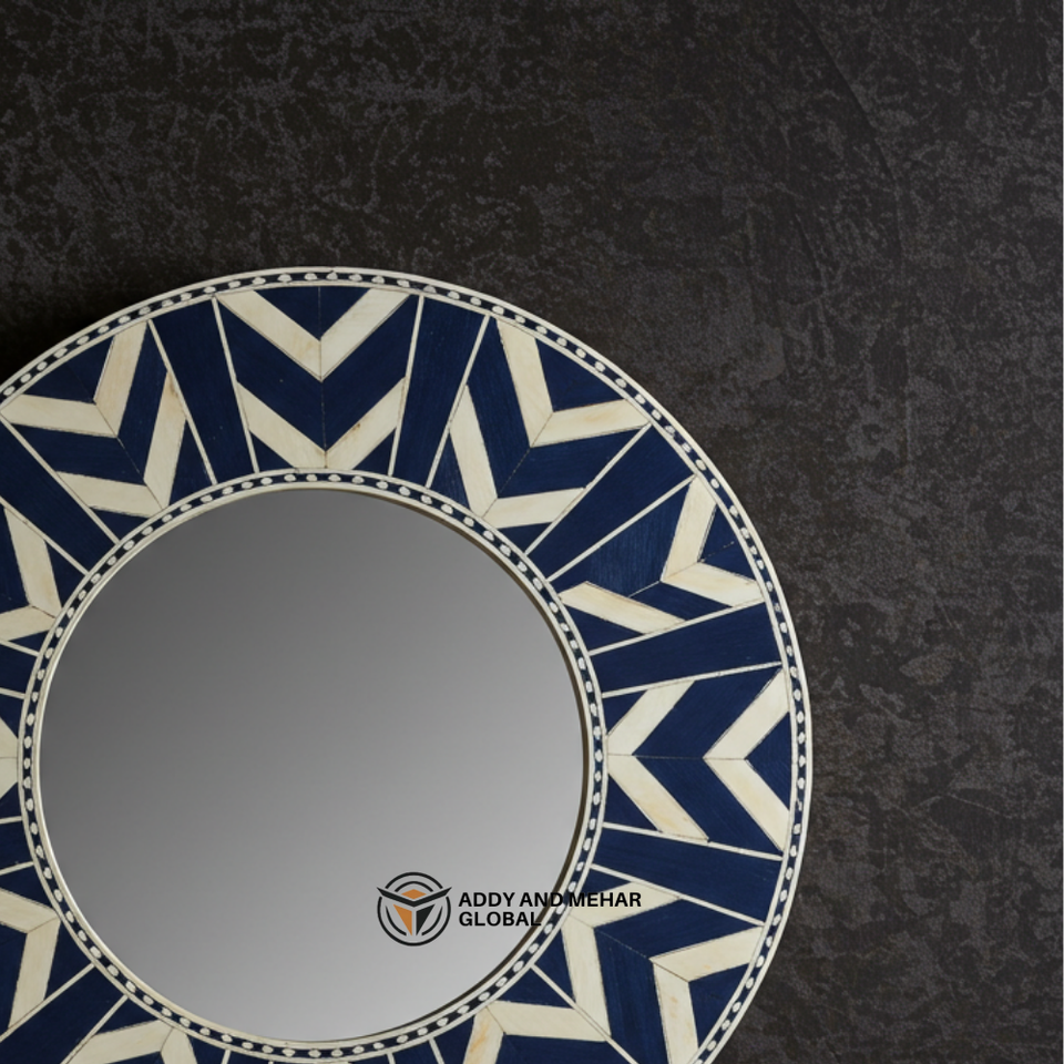 Miroir rond en os incrusté bleu et blanc fait à la main, motif géométrique en chevron de luxe, décoration murale, miroir décoratif d'accent, fait à la main