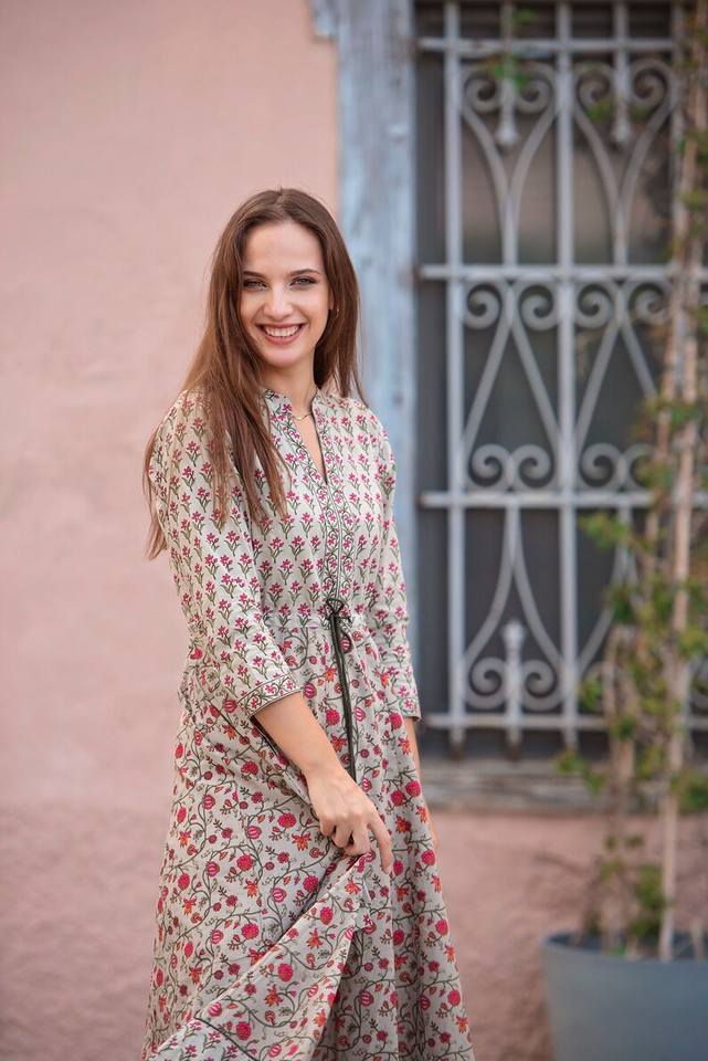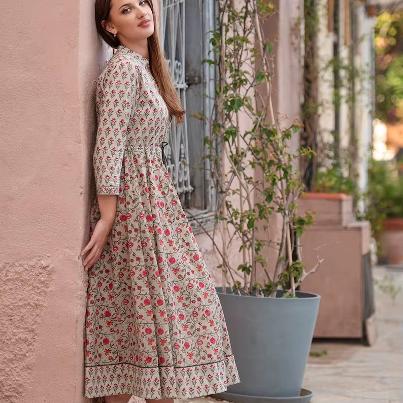 Handcrafted Bohemian Enisa Dress Pure Cotton Hand Block Printed Casual Occasional Summer Holiday Dress