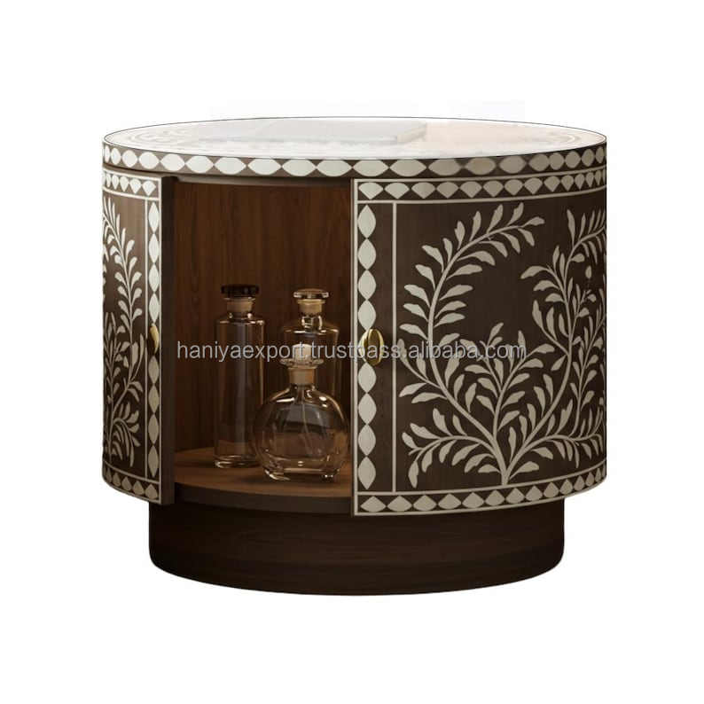 Table d'appoint artisanale en incrustation d'os avec rangement pour bouteilles Table d'appoint ronde élégante avec rangement Table de chevet Boho Accent