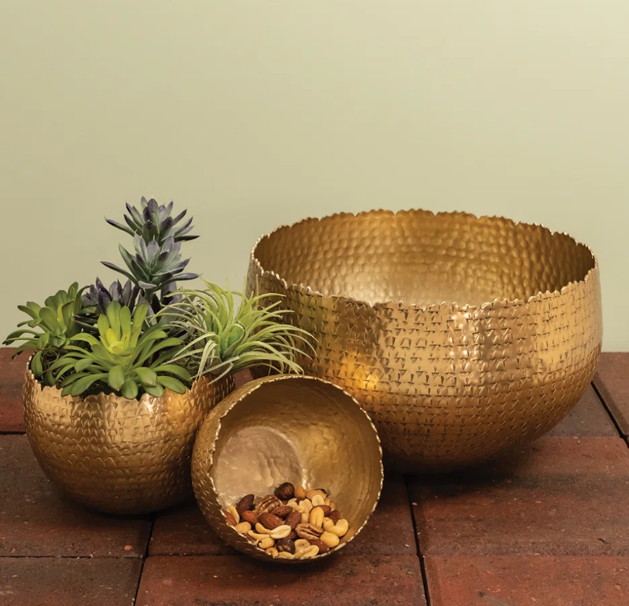 Handmade Gold Metal Mixing & Serving Bowl Brass Hammered for Home Restaurant Parties or Travel Fruit Display Included
