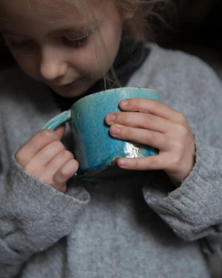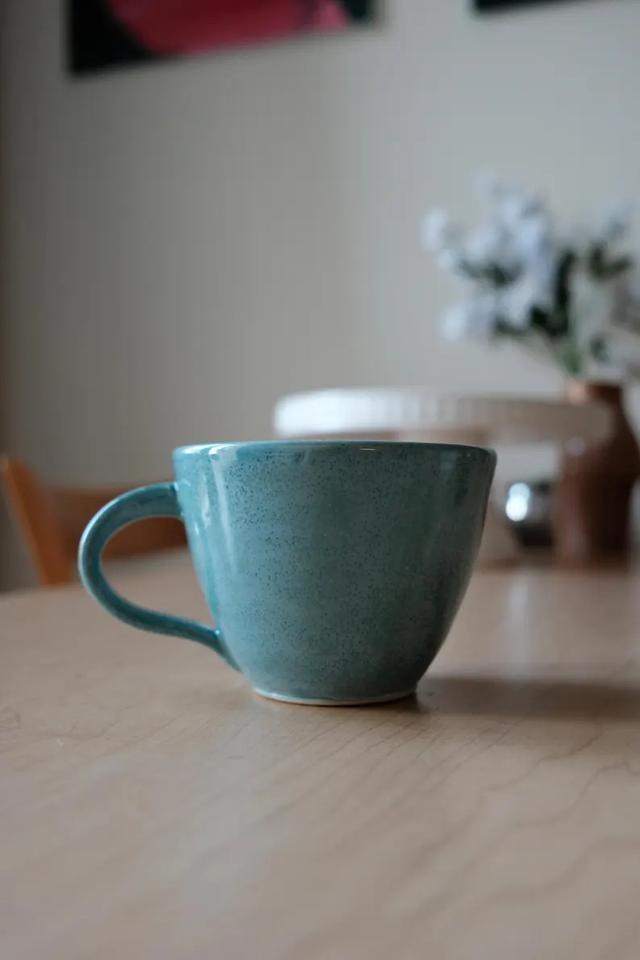 Tasse en céramique artisanale avec glaçure turquoise fluide, poignée inclinée, paroi épaisse pour une meilleure rétention de la chaleur, idéale pour un intérêt artistique.
