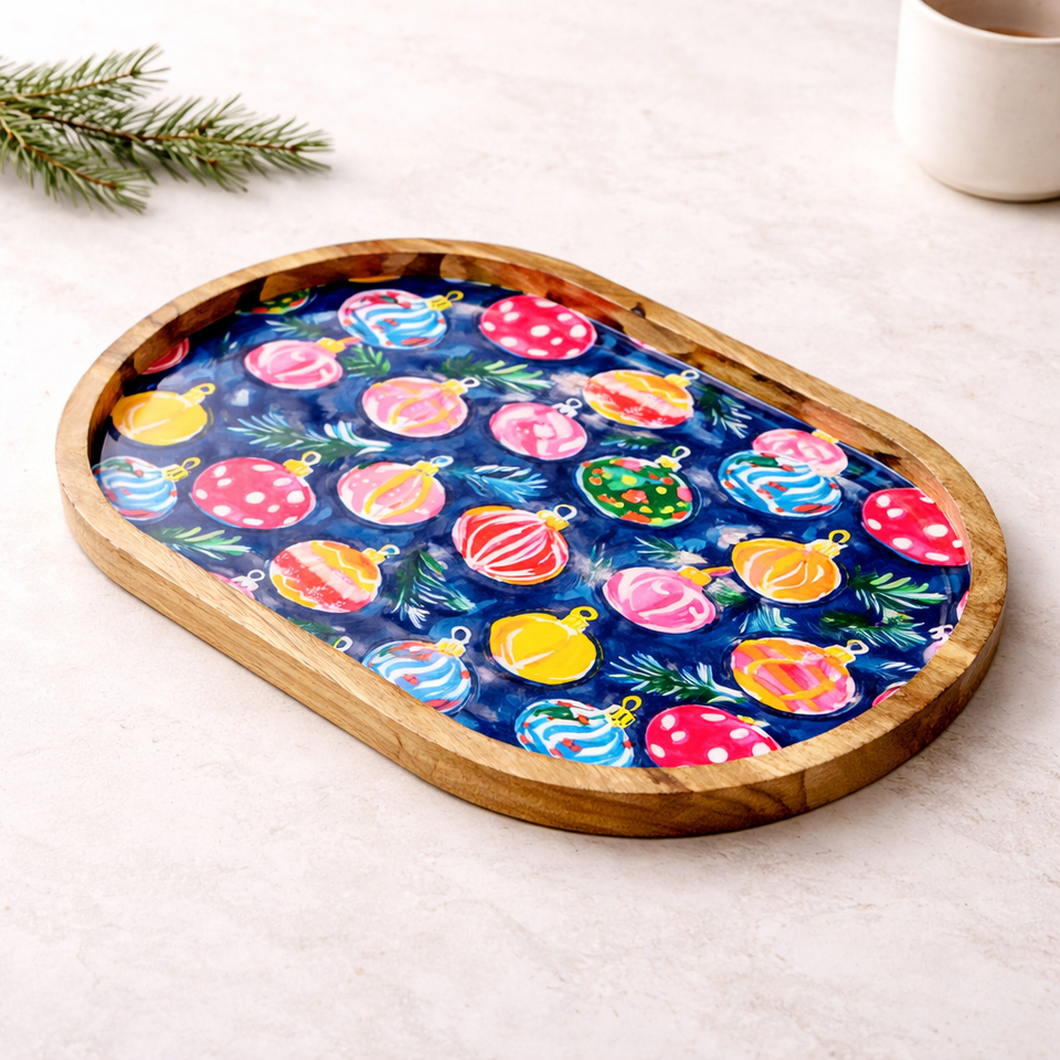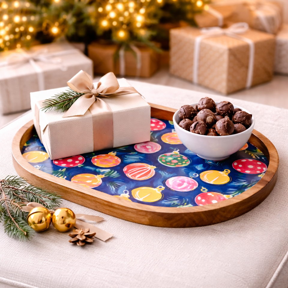 Plateau de service ovale grand format en bois de manguier émaillé, fait main, avec motif cloche, pour snacks et fruits secs, idéal pour la maison et la restauration.