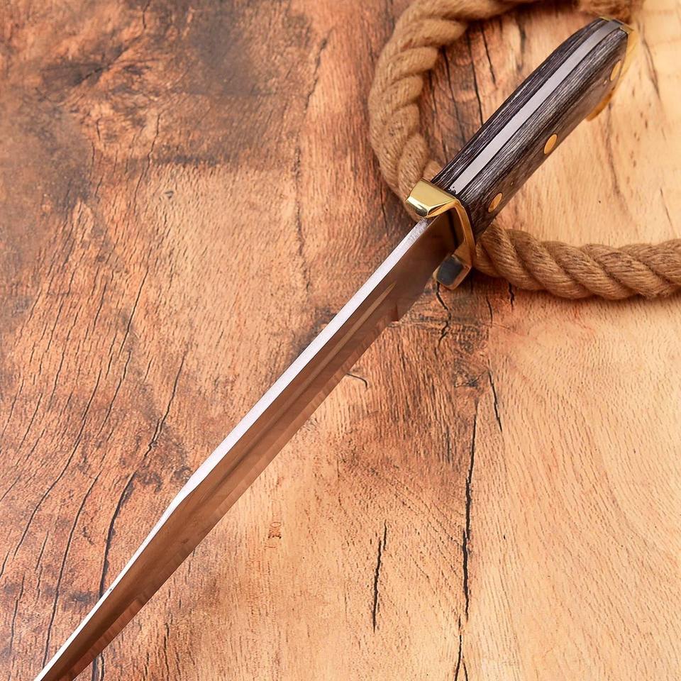 Couteau de chasse artisanal en acier D2 avec lame partiellement dentelée, manche en bois, garde et pommeau en laiton pour le camping/le dépeçage