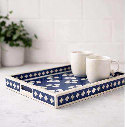 Plateau rectangulaire artisanal éco-responsable en os incrusté avec poignées, motif floral bleu et blanc, idéal pour le Ramadan et les mariages