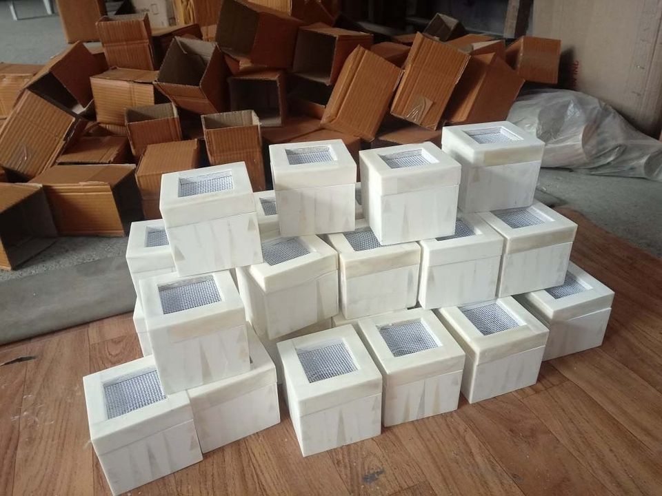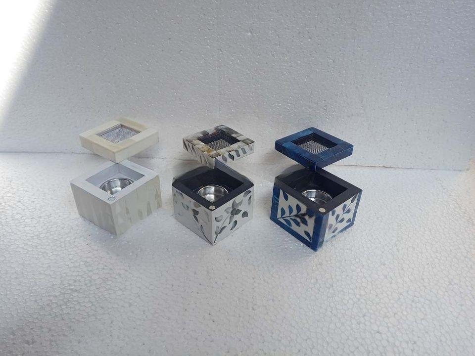 Brûleurs à Bakhoor carrés géométriques artisanaux avec incrustations, supports d'encens en bois assortis avec dessus en maille, bois de manguier aromatique