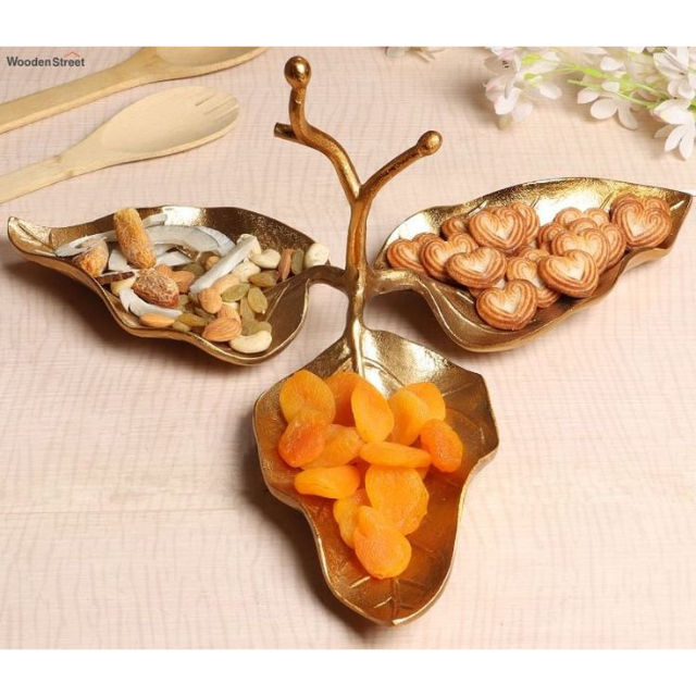 Plateau de conception de feuille plaqué or fabriqué à la main avec surface texturée pour un service de fruits unique ou un accent d'affichage de table décoratif