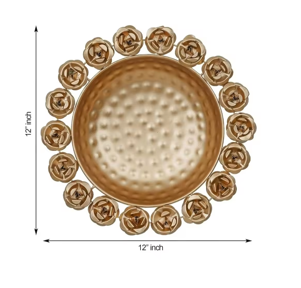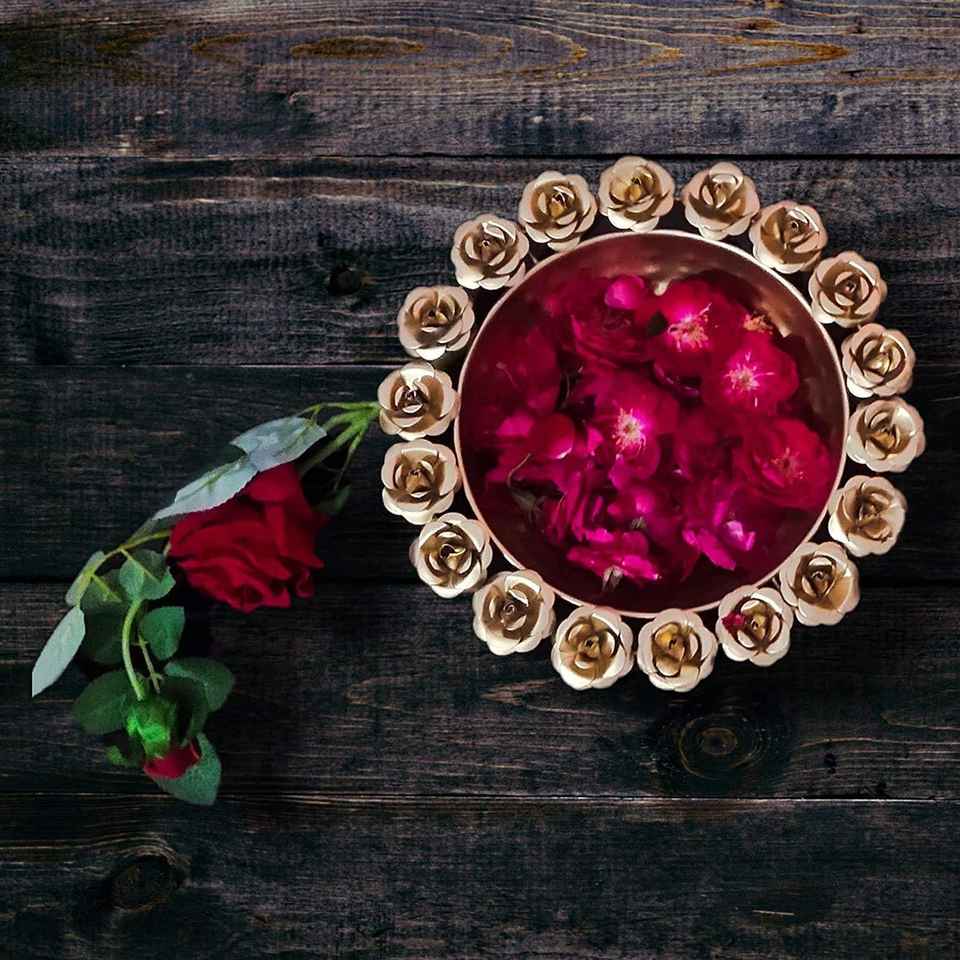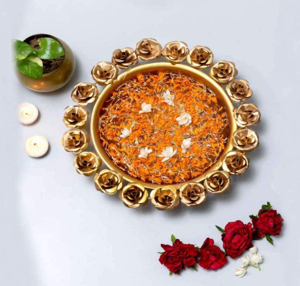 Handcrafted Golden Color Urli Bowl Beautiful Rose Floral Design Polished Brass Diwali Wedding Functions Decorative Floating